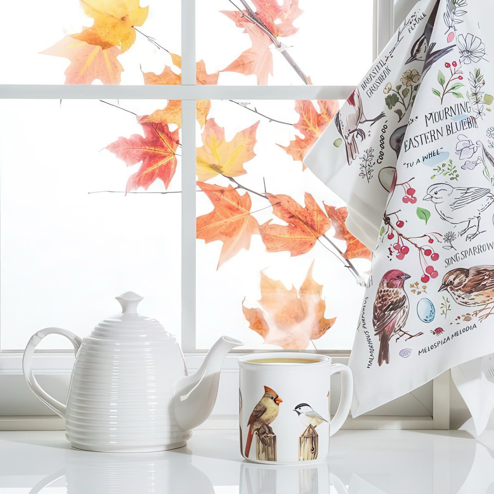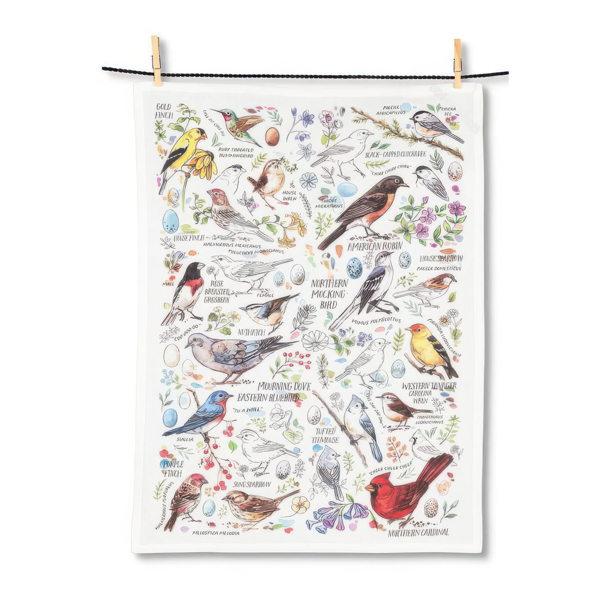 This cotton kitchen towel features a lively bird medley illustration packed with colourful details, bringing a little nature nerd joy to dish duty and kitchen decor.