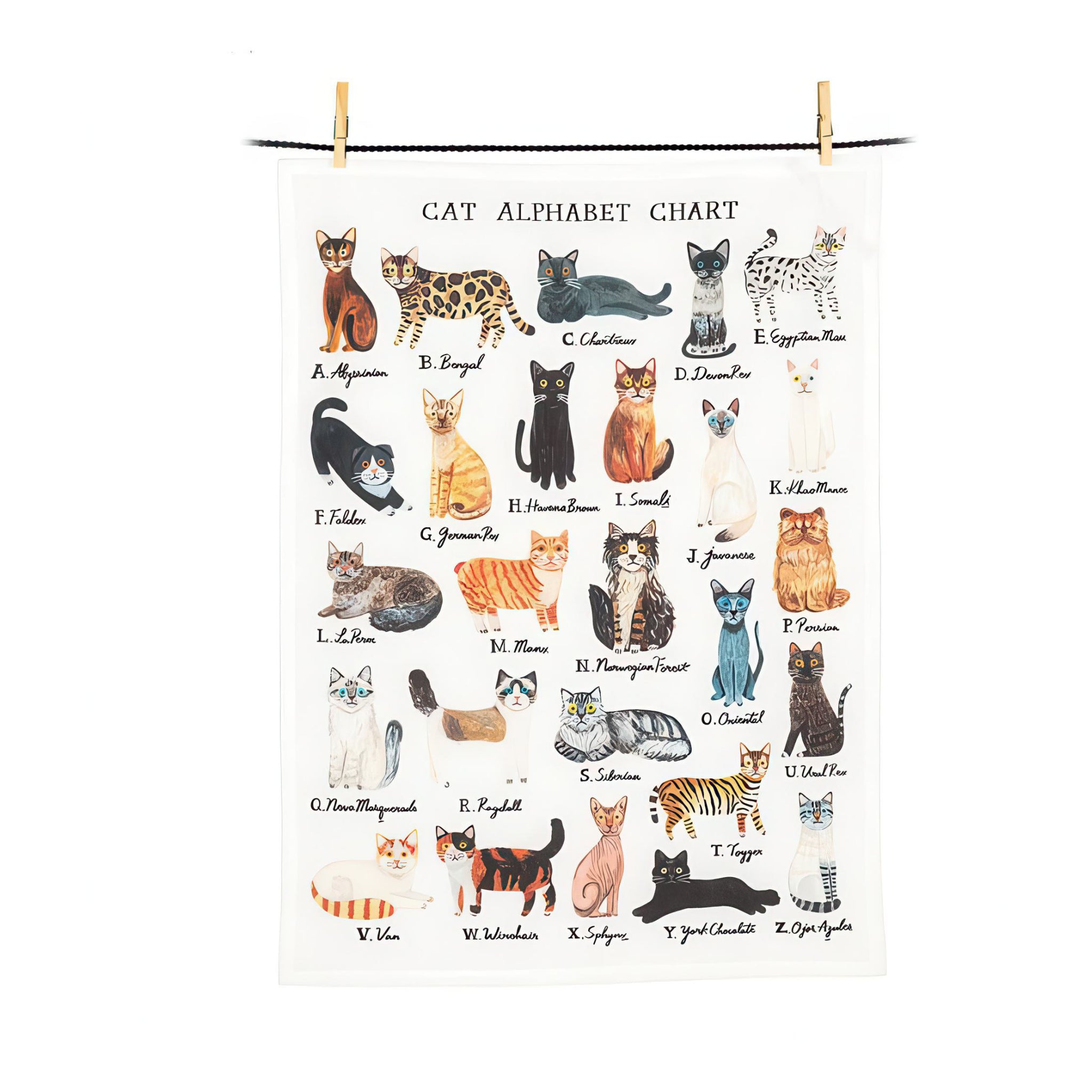 This cotton kitchen towel features a cat alphabet chart filled with illustrated breeds from a to z. A fun, feline twist on dish duty that doubles as charming kitchen decor.