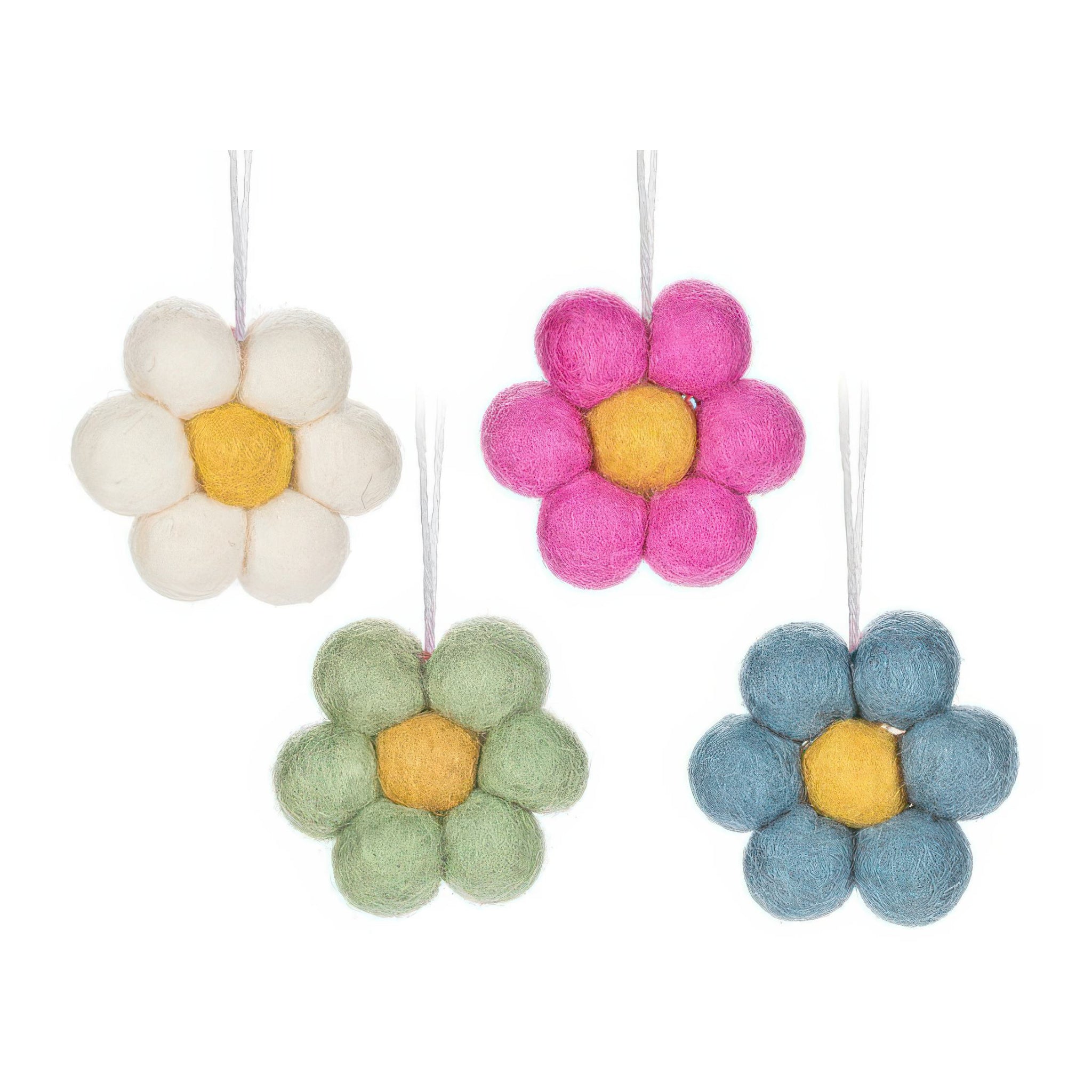 This pompom daisy ornament adds a soft pop of colour anywhere it hangs. Handcrafted from wool felt by women artisans in Nepal.