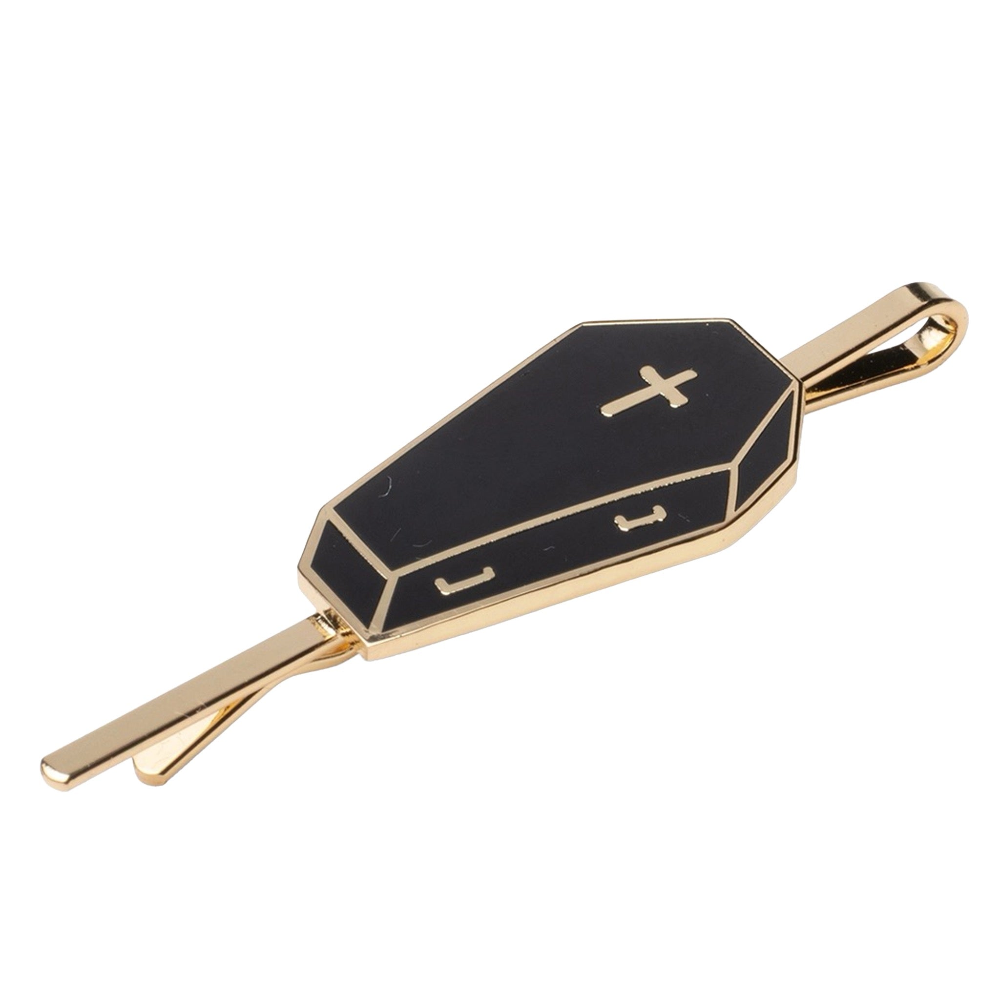 A delightfully dark hairpin shaped like a tiny coffin, finished in glossy black and gold for a spooky little accent that still feels polished.