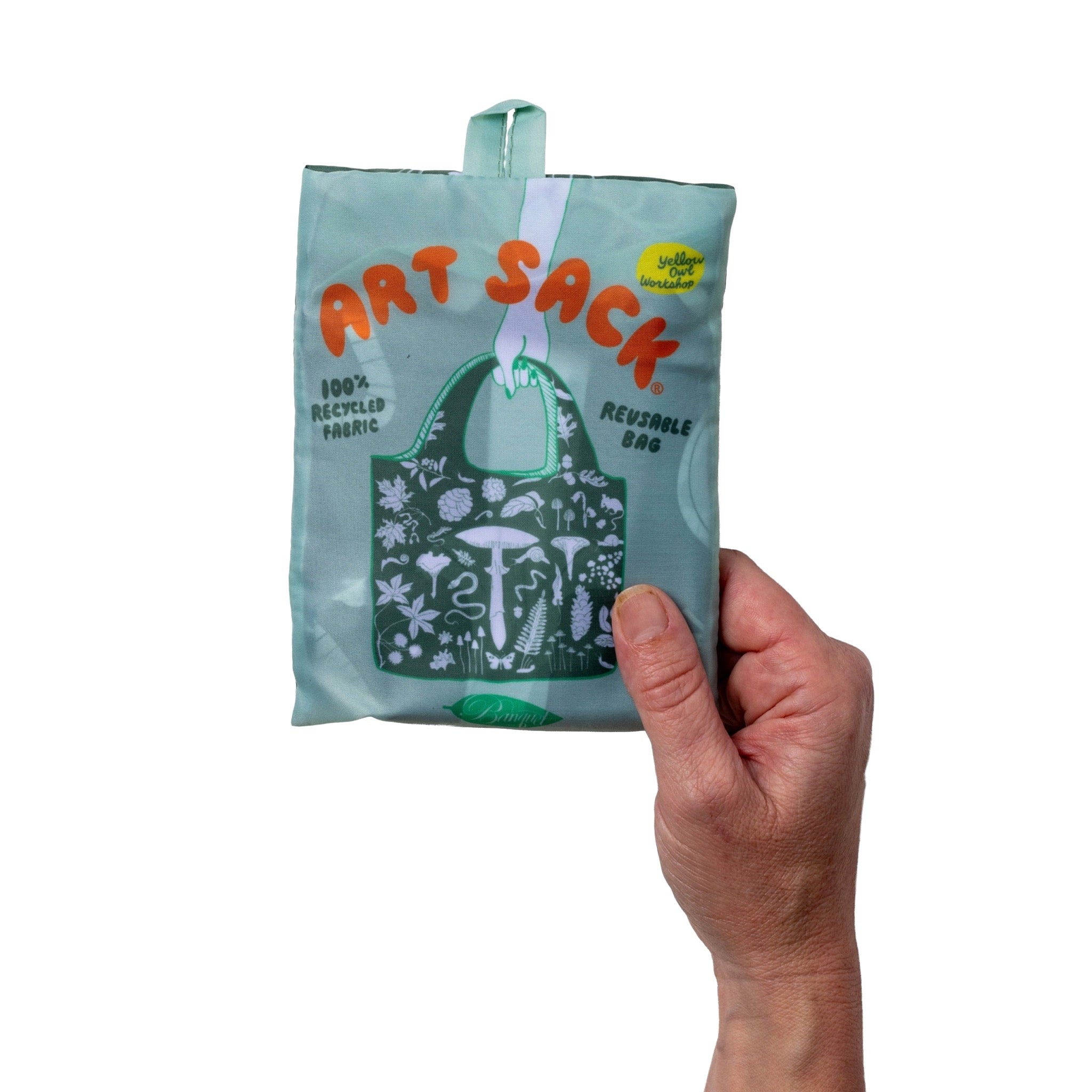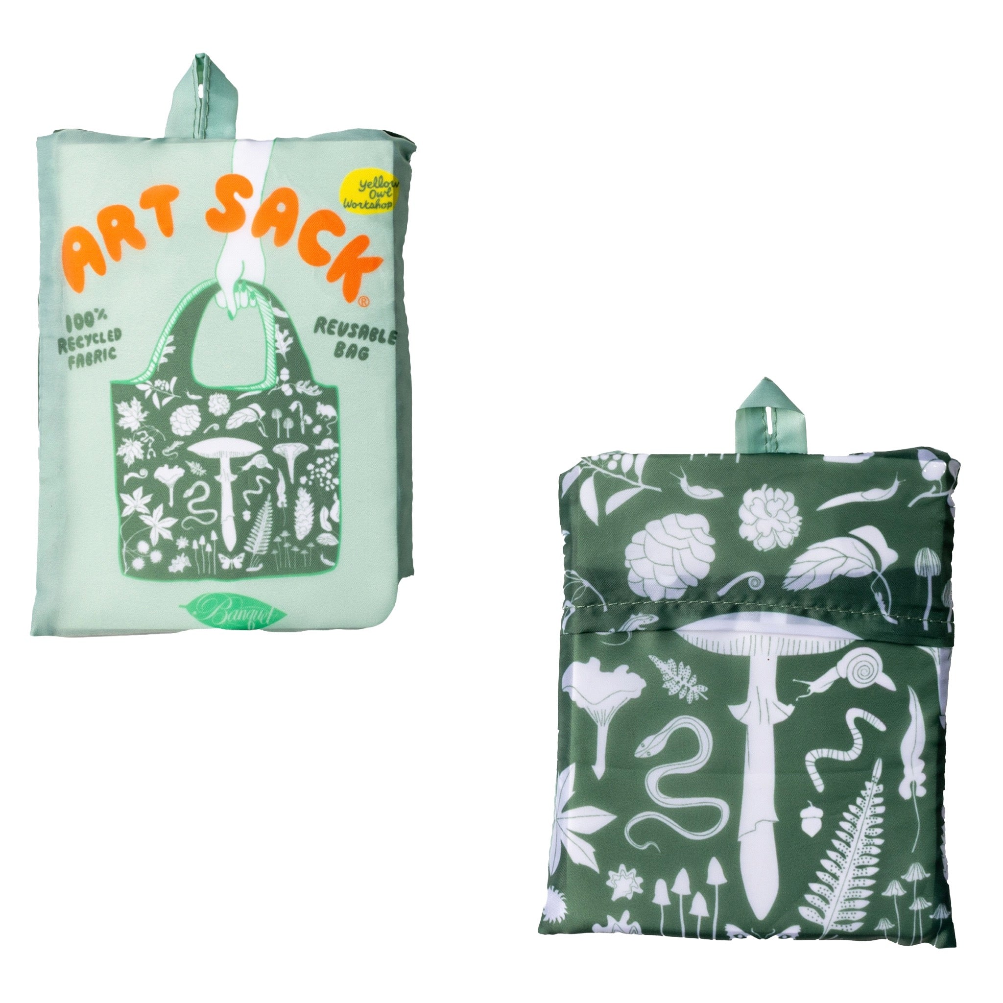 Turn errands into exhibitions with this forest inspired art sack filled with mushrooms, leaves, ferns, and woodland details. A reusable tote that folds into itself and brings nature loving charm to everyday hauling.