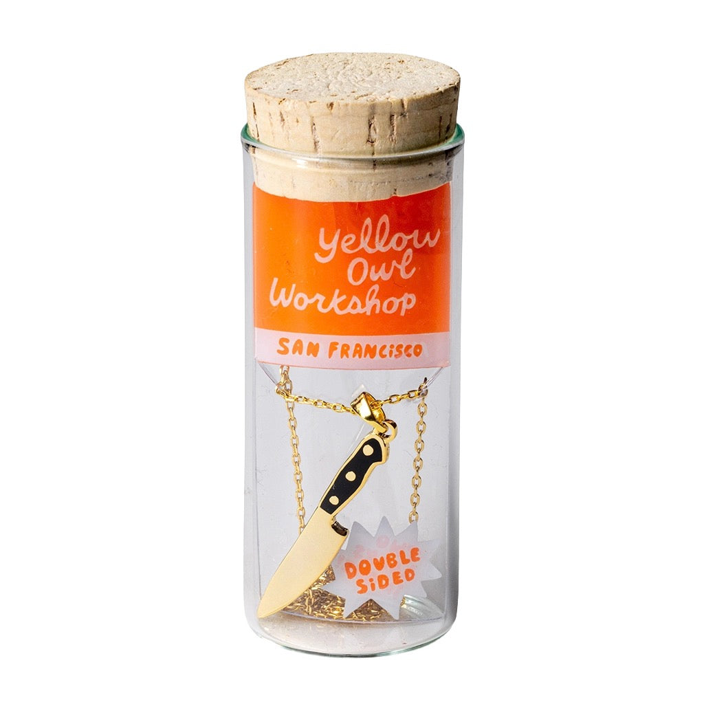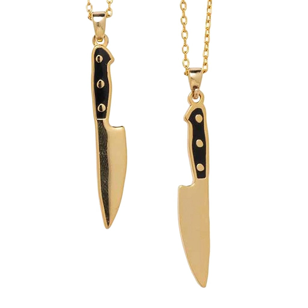 Twice the edge in one necklace. This double sided knife pendant flips for two bold looks, finished in glossy gold with a sleek, wearable chain.