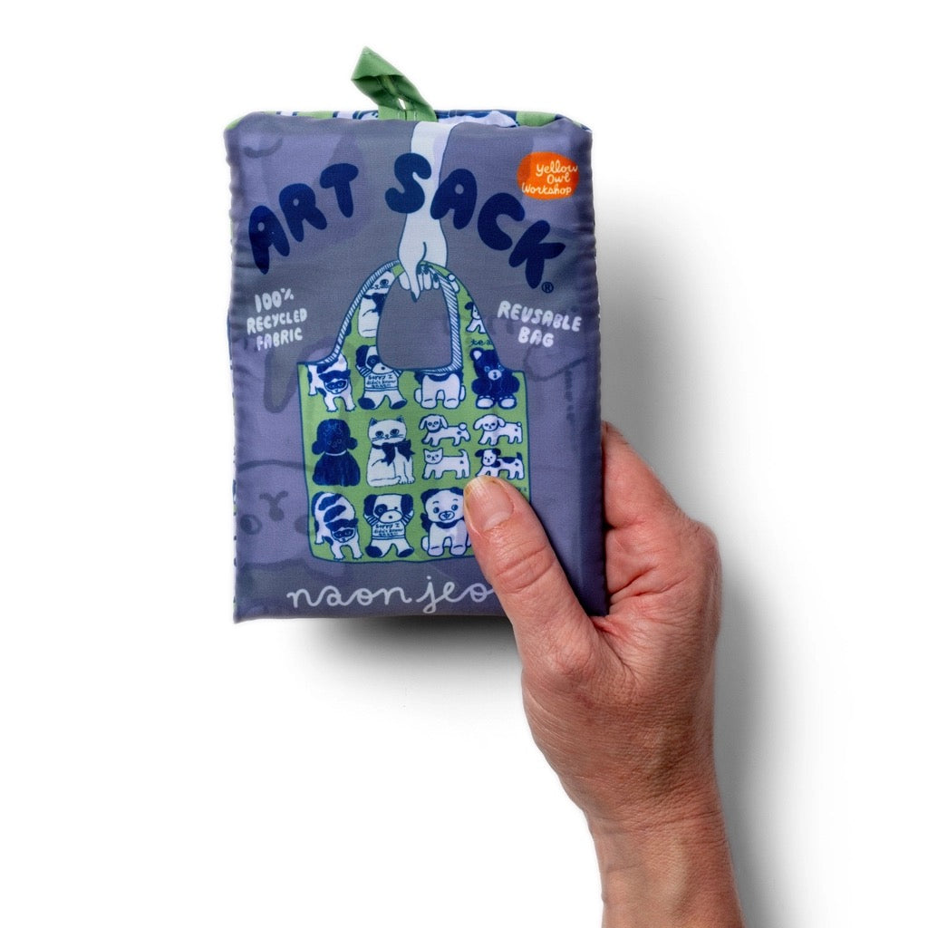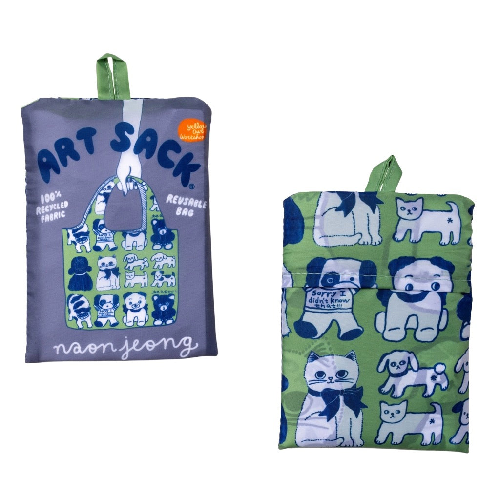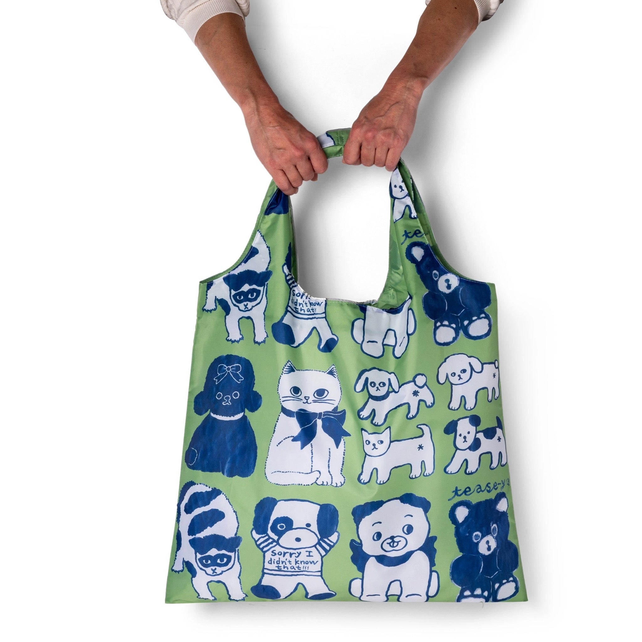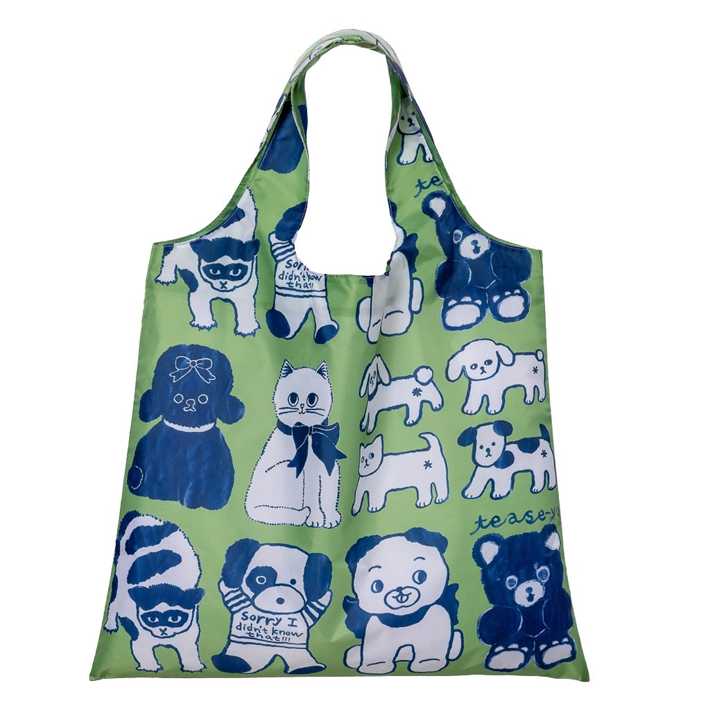 Turn errands into exhibitions with this cozy art sack filled with hand-drawn cats, dogs, and teddy bears. A reusable tote that folds into itself and adds sweet, snuggly charm to everyday hauling.