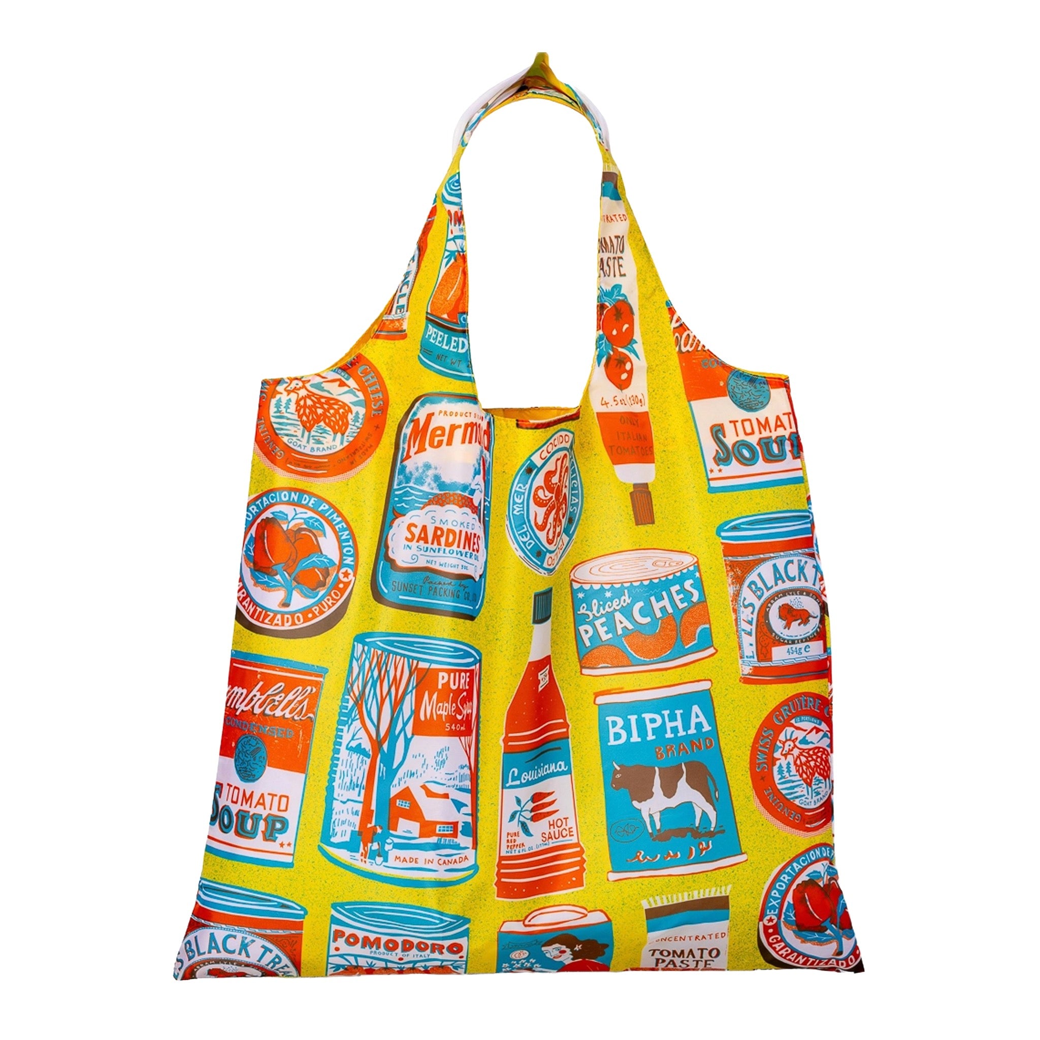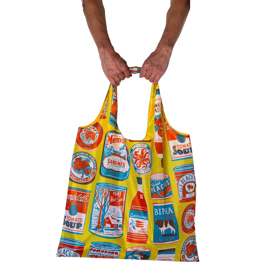 Turn errands into exhibitions with this reusable art sack featuring playful vintage food tin illustrations. A foldaway design with sturdy handles makes it perfect for groceries, markets, or everyday hauling.