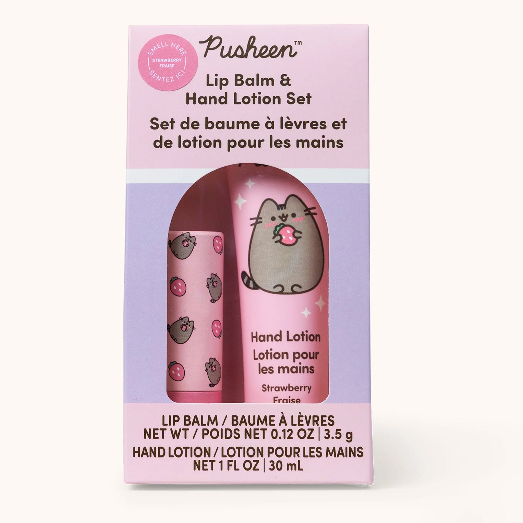 Keep lips soft and hands smooth with the Pusheen strawberry lip balm and hand lotion set. The unscented lip balm nourishes dry lips, while the lightly strawberry scented lotion hydrates hands and cuticles. Perfectly sized for travel, this cute two piece set makes a fun gift or everyday essential.