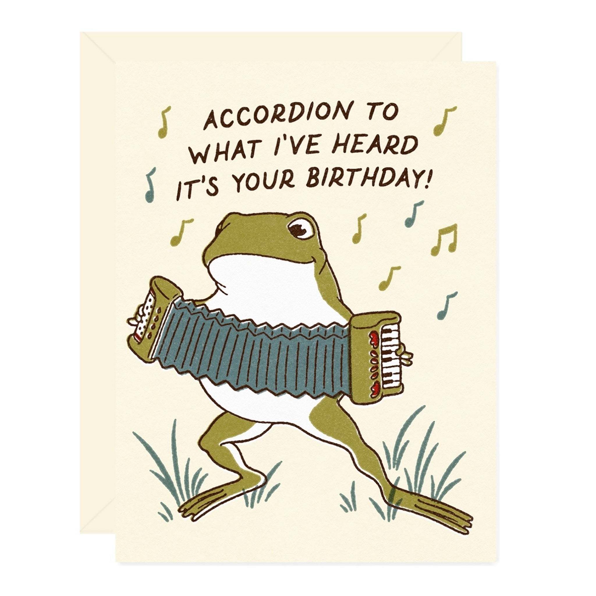 A punny birthday card featuring an accordion-playing frog and a perfectly groan-worthy line. Ideal for music lovers and anyone who appreciates a good dad joke.