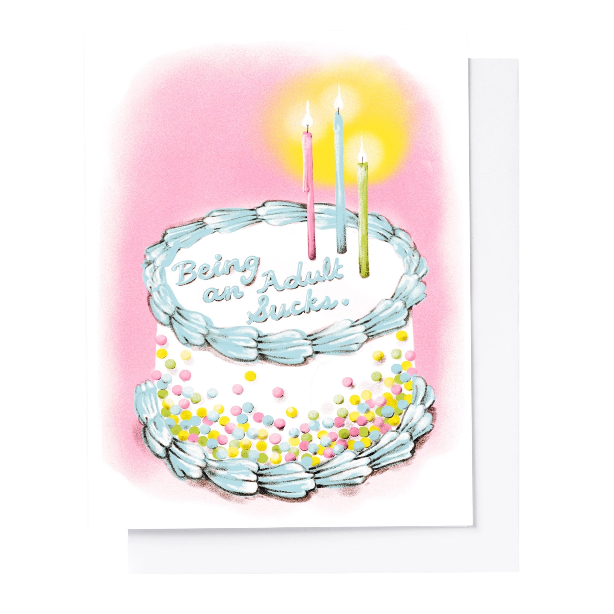 A cheeky birthday card with a frosted cake illustration and layered risograph texture, perfect for laughing through the realities of growing up.