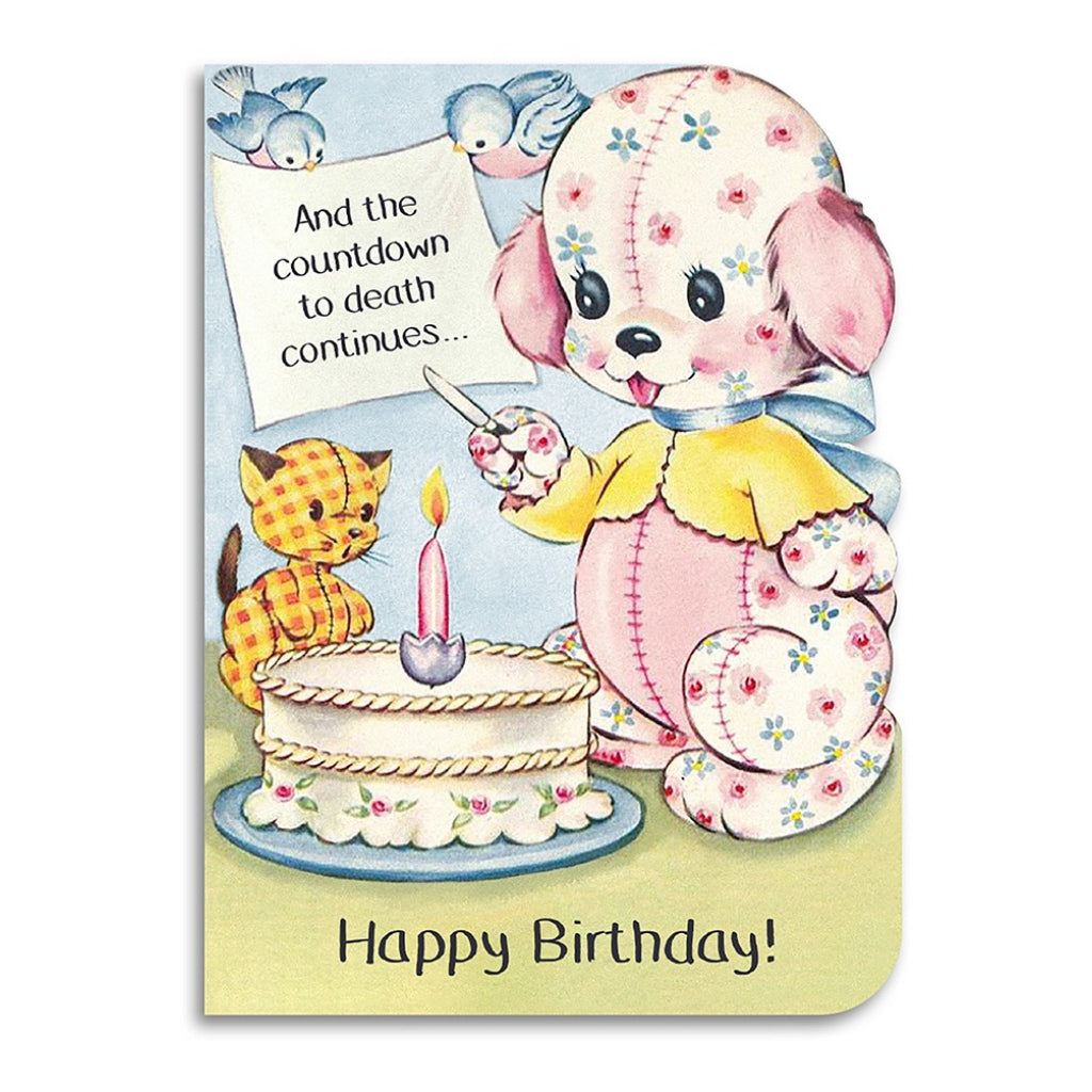 This vintage inspired birthday card brings cute artwork and dark humour in one perfectly timed punchline. A funny pick for anyone who can laugh about another year on the clock.