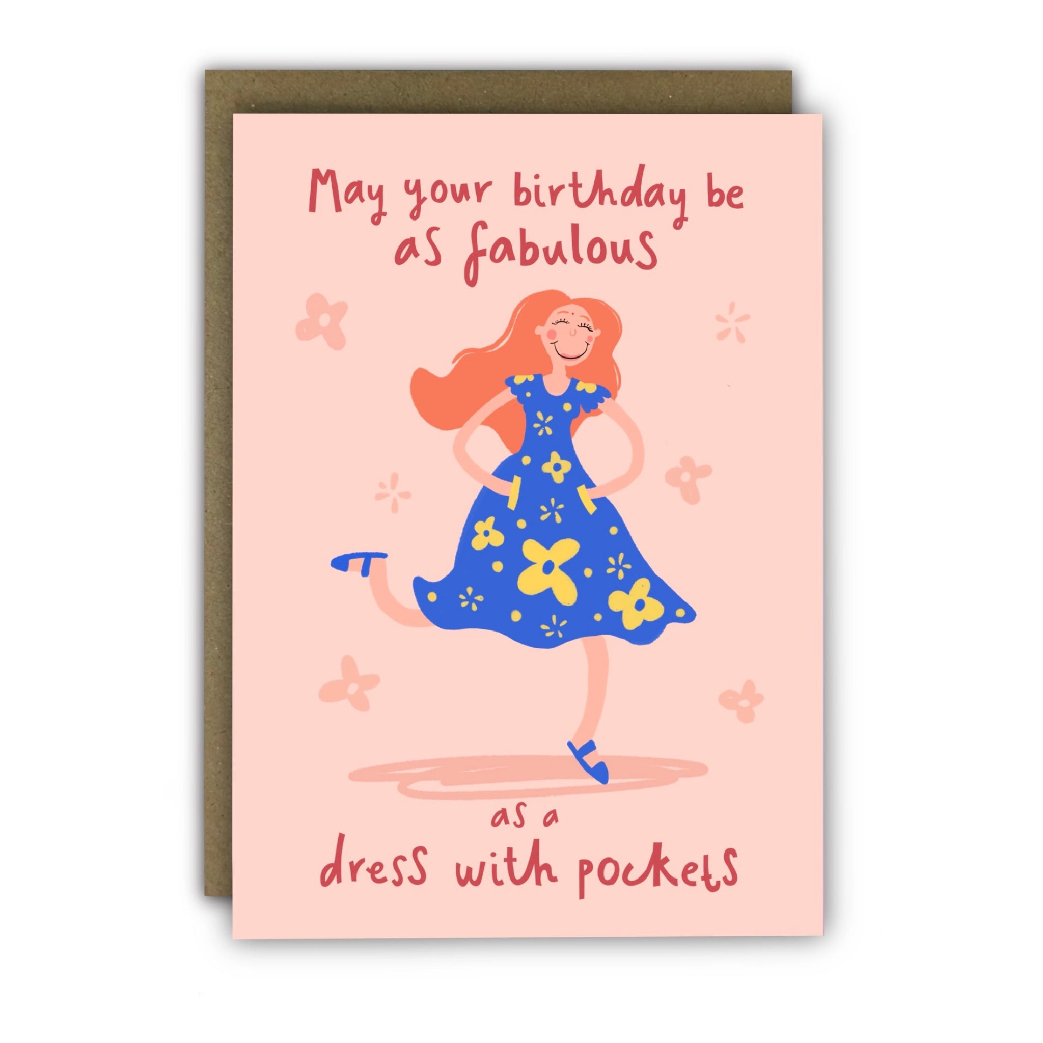 Dress With Pockets Birthday Card with playful charm and colourful style, wishing a birthday as fabulous as everyone’s favourite hidden feature.