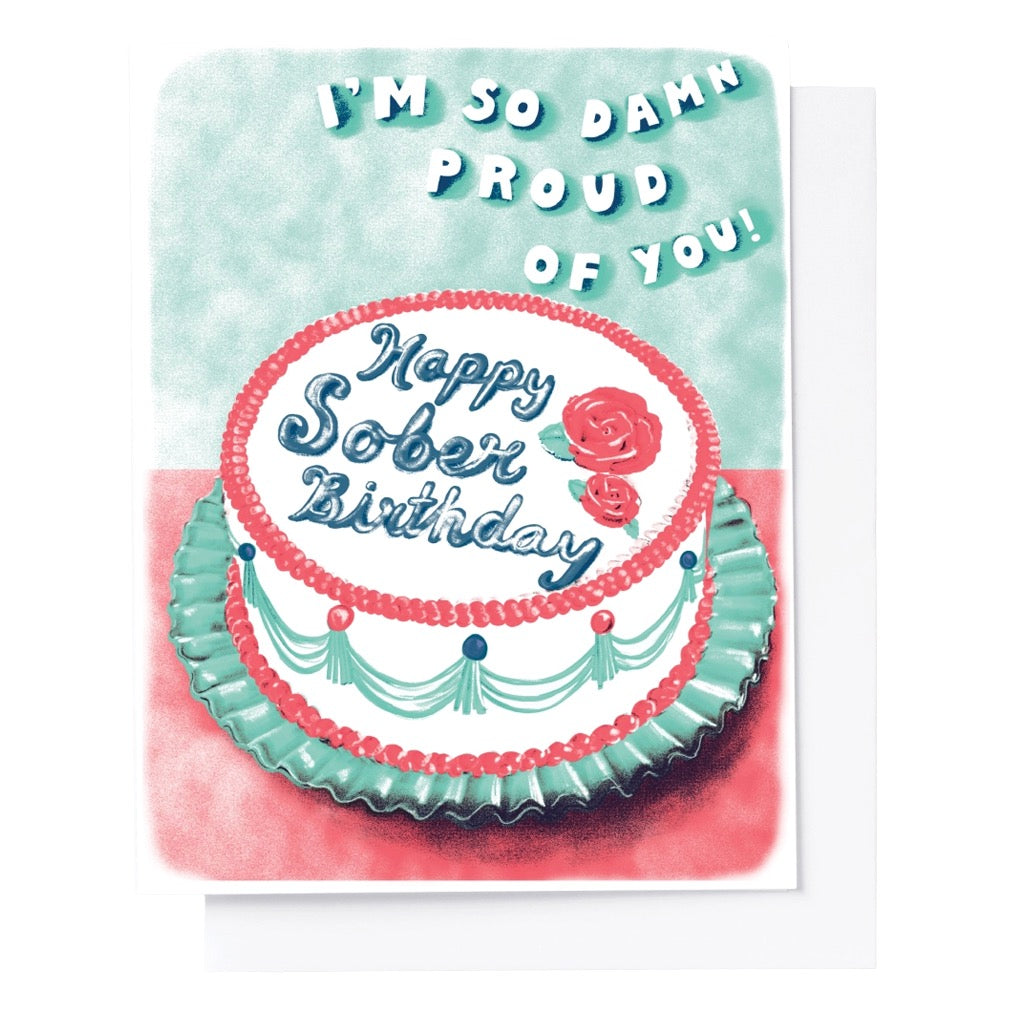 A joyful risograph birthday card celebrating sobriety with vintage cake art and layered colour, perfect for marking a meaningful milestone with pride.
