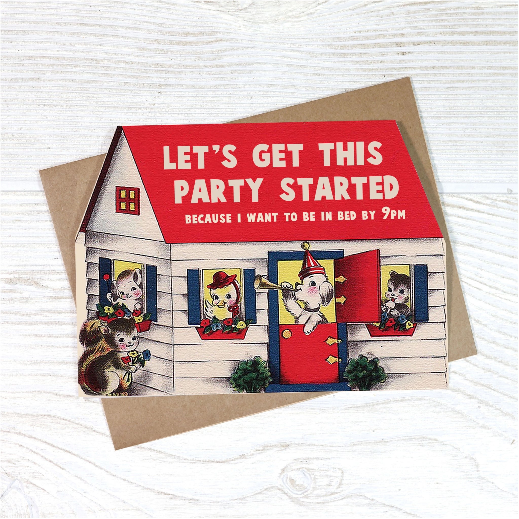 This vintage inspired card celebrates early nights and realistic party goals. A funny pick for anyone who loves a good time but loves sleep more.