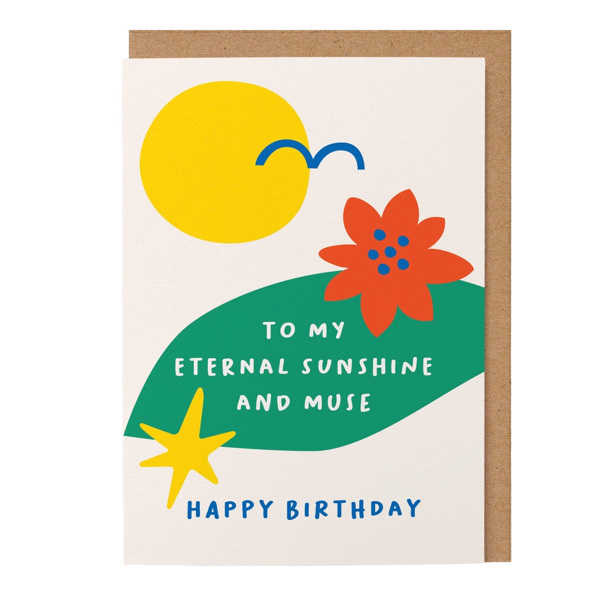 A joyful birthday card featuring sunshine, flowers, and playful shapes, designed to celebrate someone who brings light and inspiration to everyday moments.