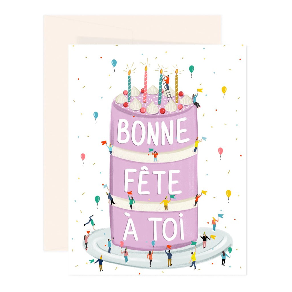 Celebrate en français with this playful bonne fĂȘte cake card featuring a towering birthday cake and festive details. Printed on thick card stock and blank inside for your message.