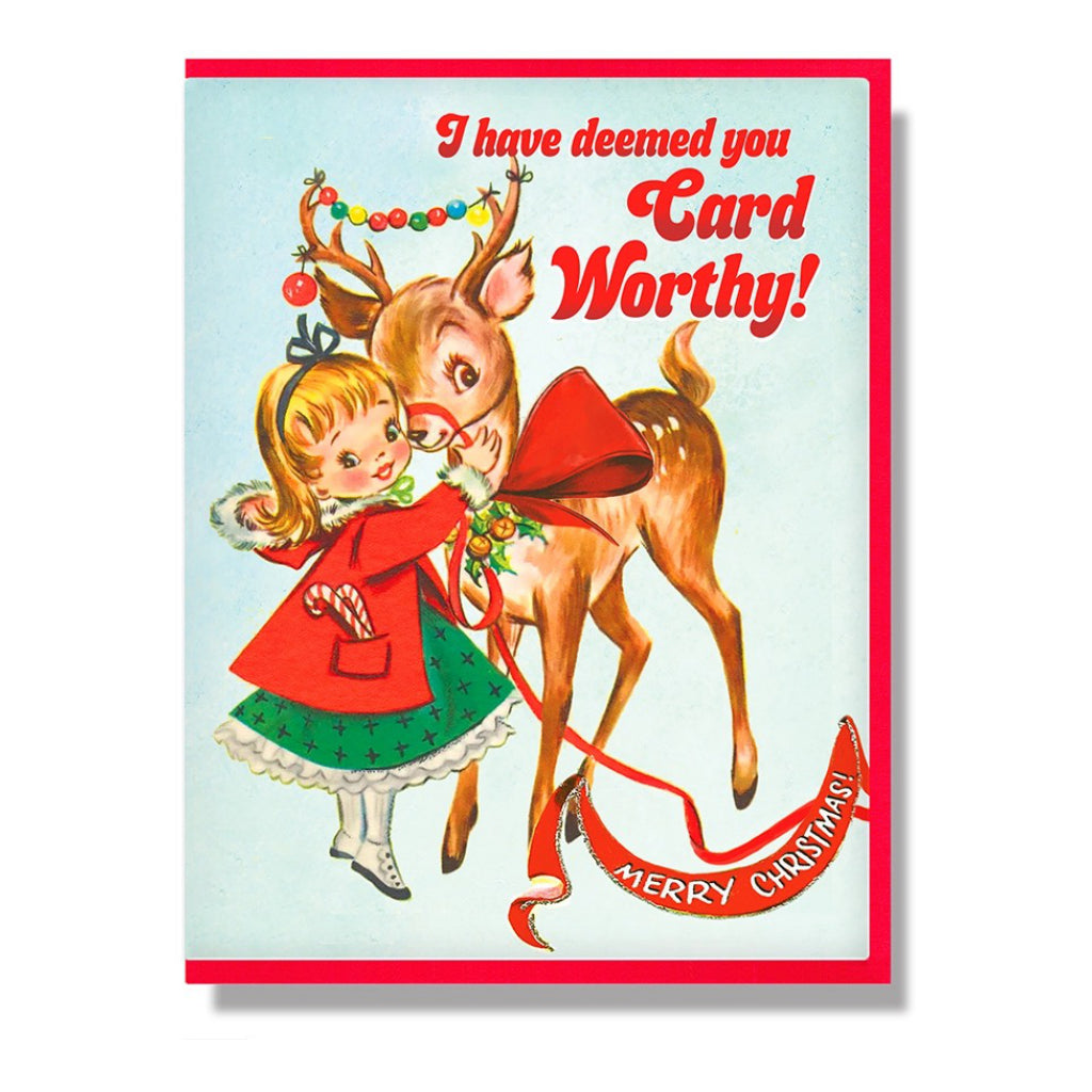 Vintage sweet with a mischievous twist, this holiday card delivers playful judgement and festive charm with bright red foil and classic Christmas illustration.