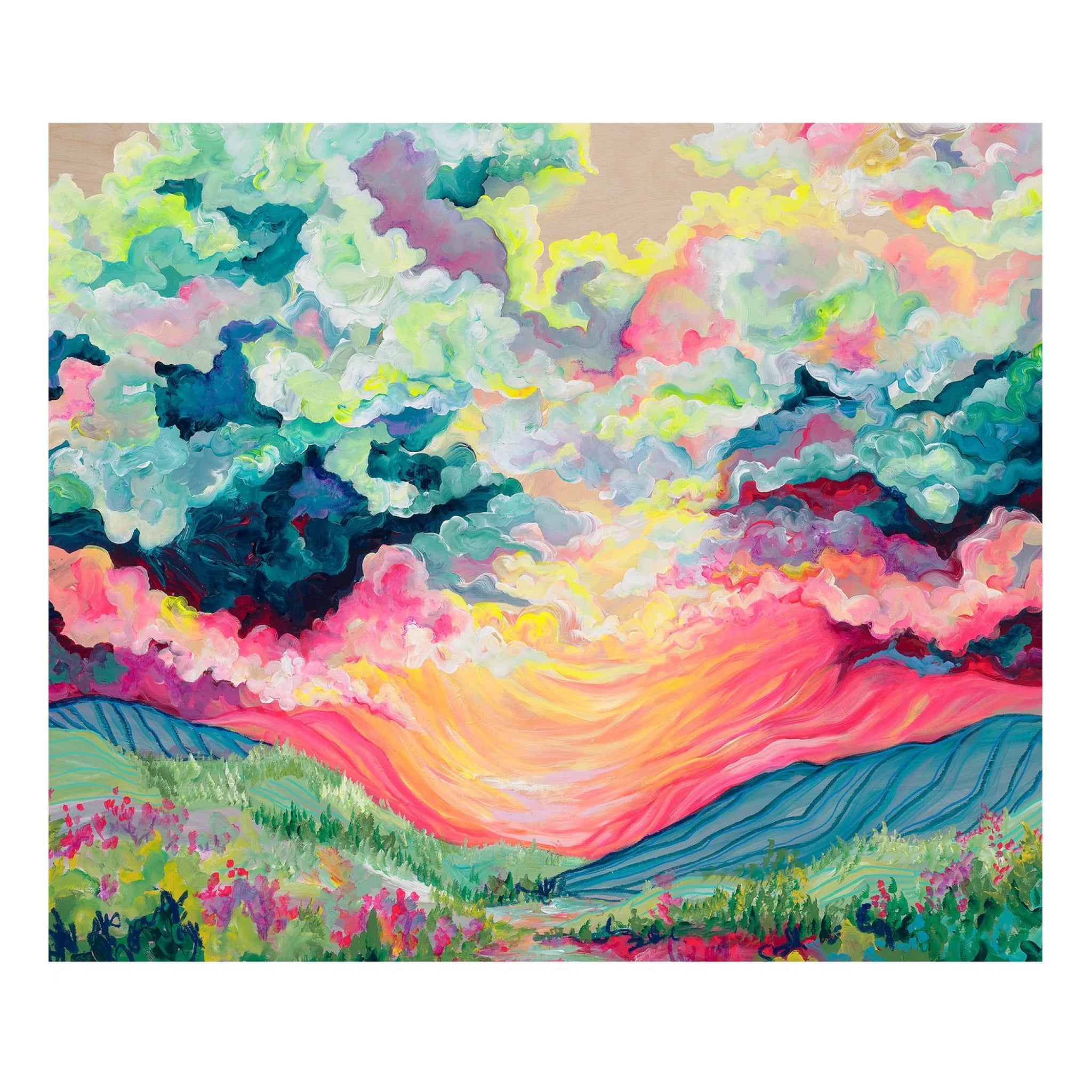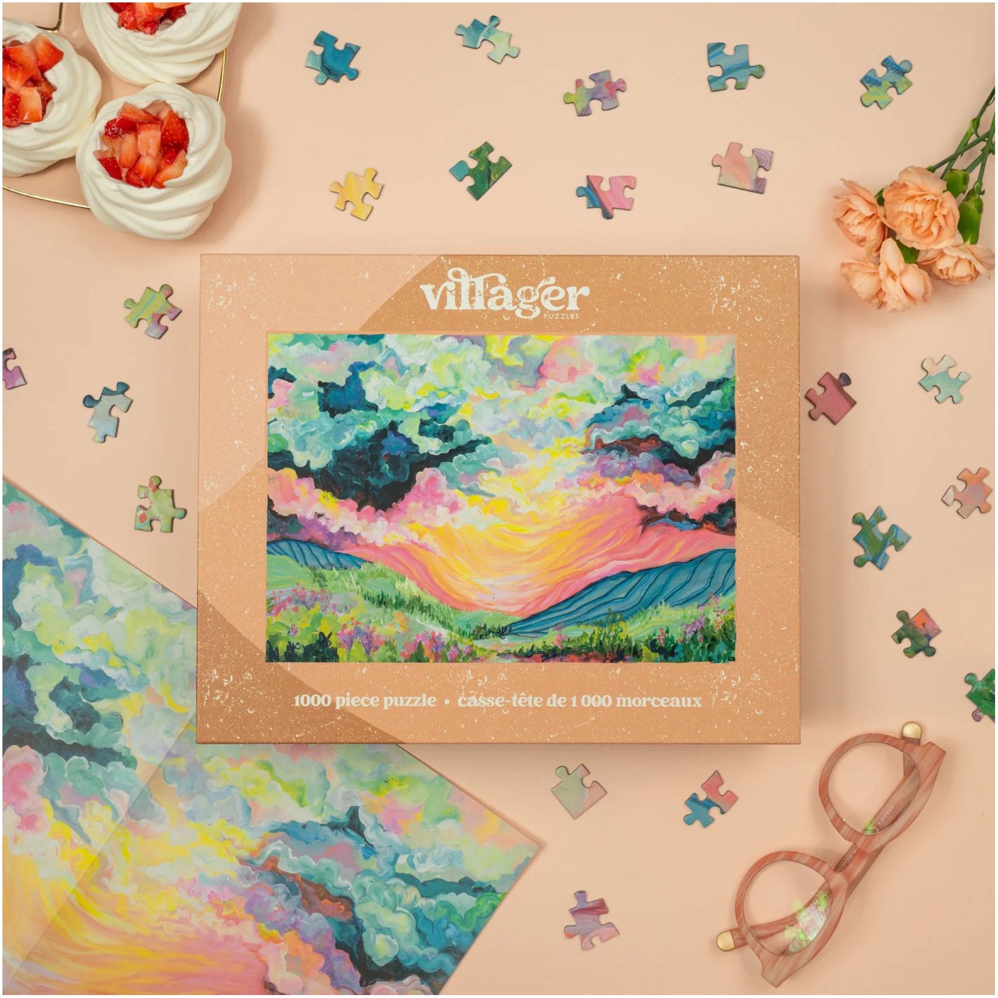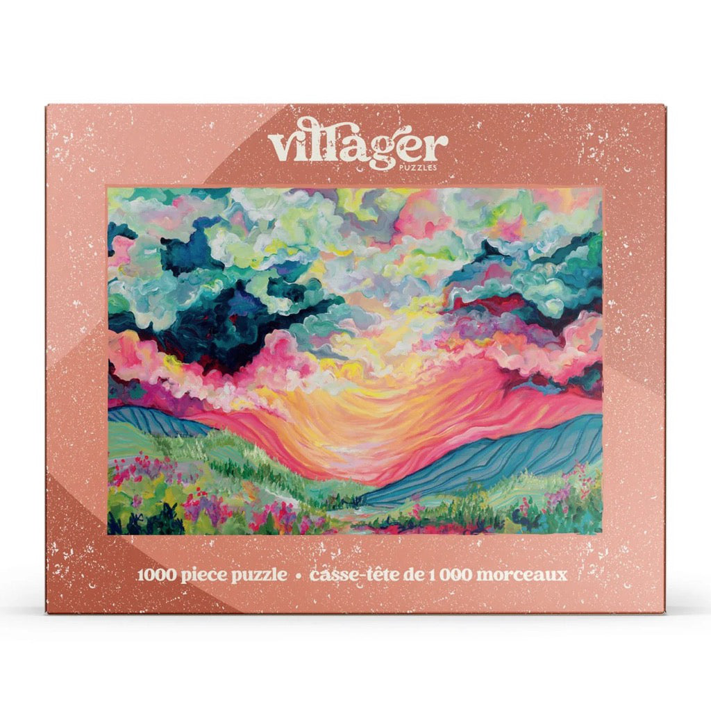 Awaken your senses with the Daybreak Puzzle, an abstract landscape by Toronto artist Julie Amlin featuring a bold sunrise over fields and flowers.