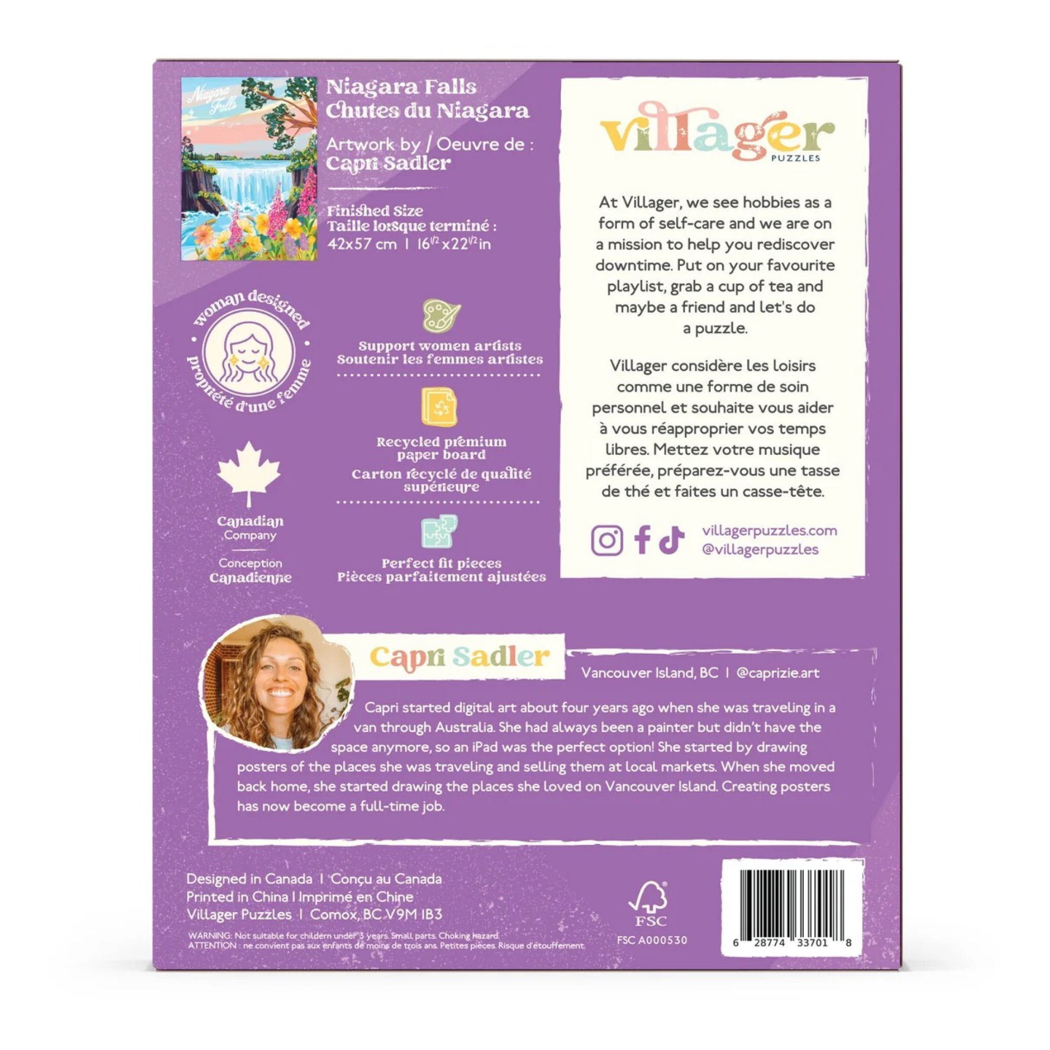 Experience the rush of one of Canada’s most famous landmarks with the Niagara Falls Puzzle, a vibrant scene illustrated by BC artist Capri Sadler. This detailed design shows the falls from above, with tour boats gliding through mist and roaring waters below. Perfect for travel lovers, this puzzle brings the excitement of Niagara and the beauty of adventure to your table, piece by piece.