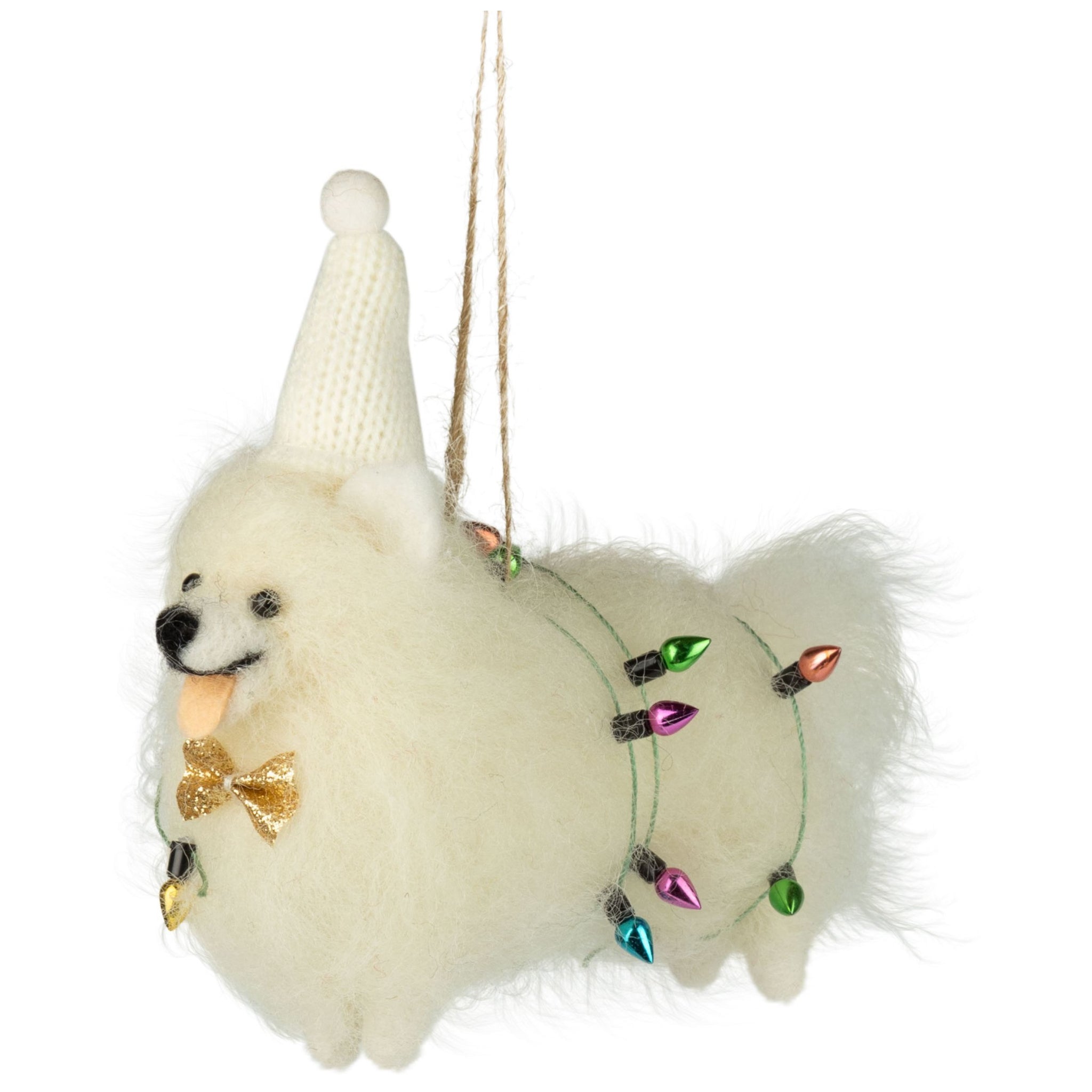 This festive felt dog ornament, decked out in colorful lights and a cozy hat, is ready to bring some playful cheer to your holiday decor.