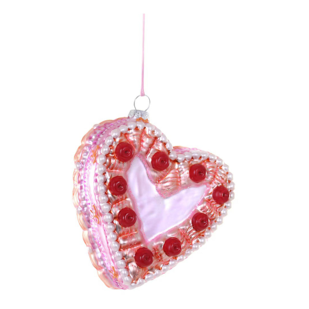 A sweet glass ornament shaped like a heart cake, topped with rosy details and pearl accents. Playful and a little over the top, it adds a sugary pop of charm to any tree.