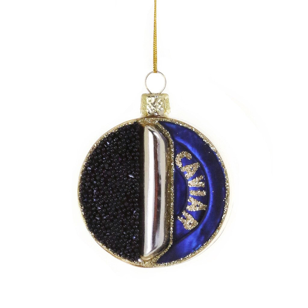 A glass ornament shaped like a luxe tin of caviar, complete with glossy detail and a hint of sparkle. Equal parts fancy and fun, it brings a playful touch of indulgence to the tree.