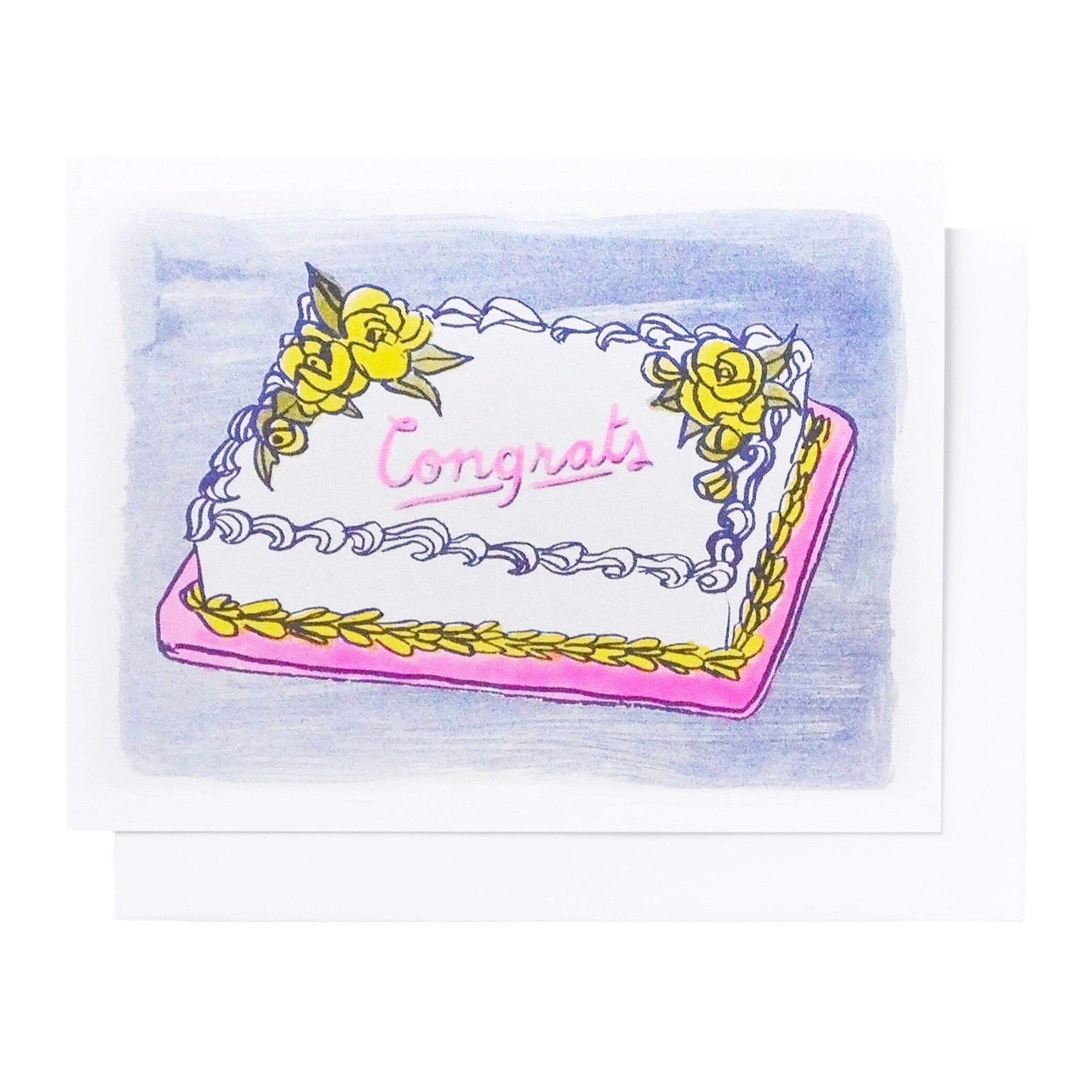 This sweet risograph card features a hand drawn celebration cake with soft colors and playful charm, perfect for sharing congratulations in a warm, handmade style.