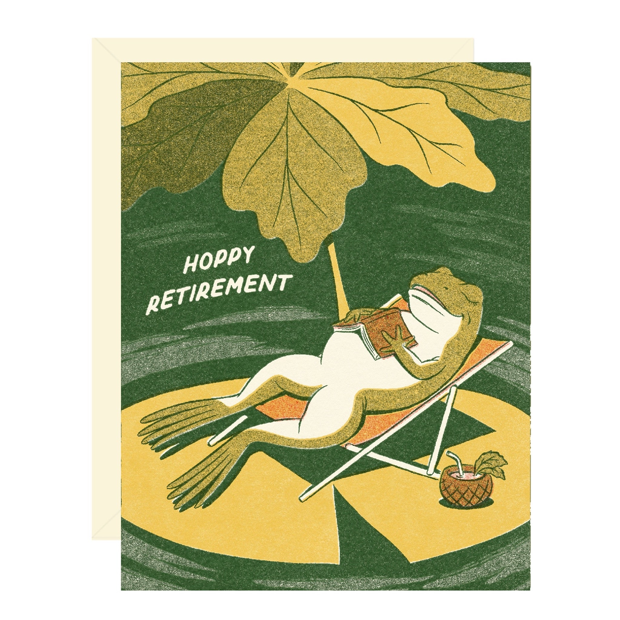 Send them off in style with a lounging frog and a “Hoppy retirement” pun.