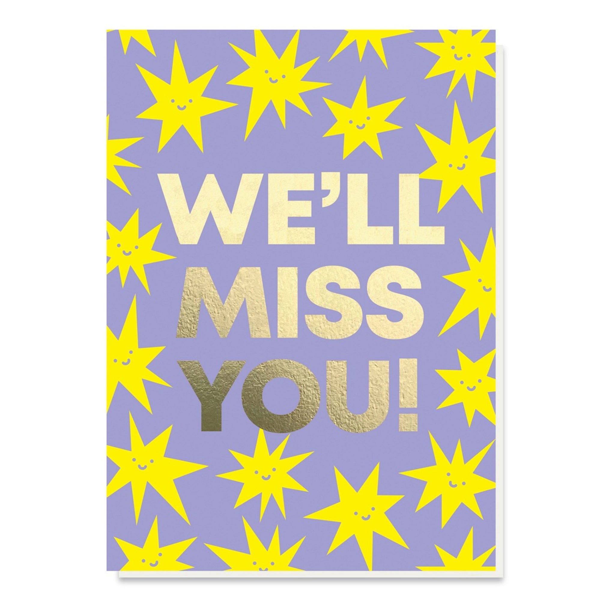 Send a bright farewell with the We’ll Miss You Smiley Stars Card, a cheerful gold foil design that shines for goodbyes and new adventures.