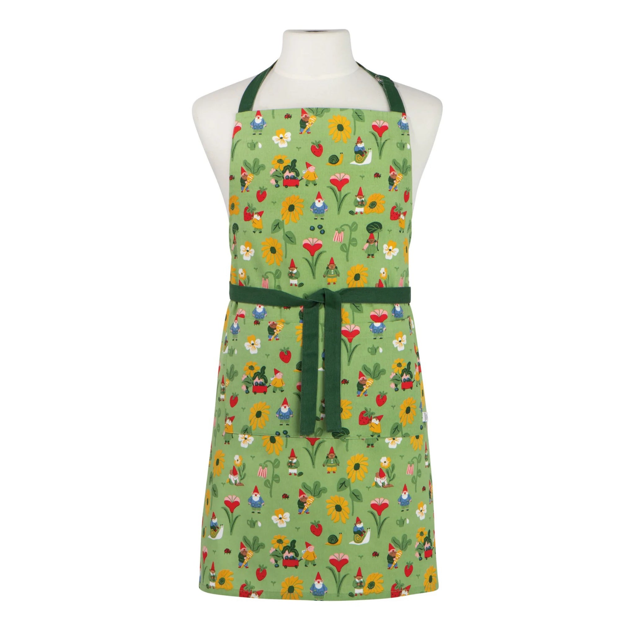 This Gnome Grown apron brings storybook charm to cooking with playful garden details that feel sweet and nostalgic. Red capped gnomes, busy snails, and bright blooms add a touch of magic to everyday kitchen tasks.