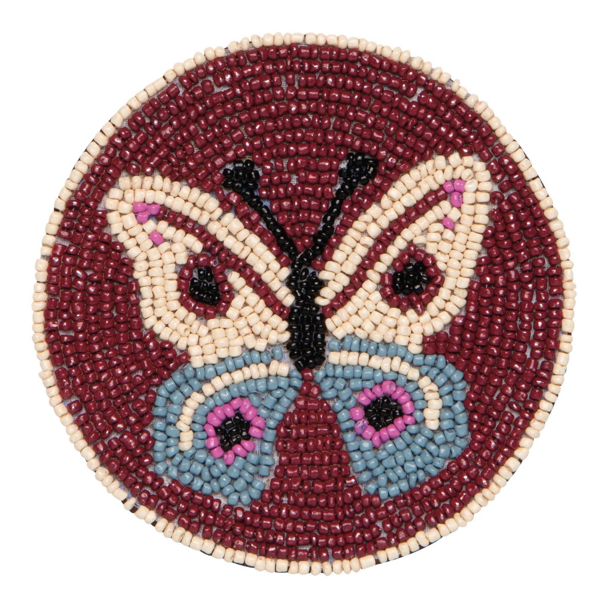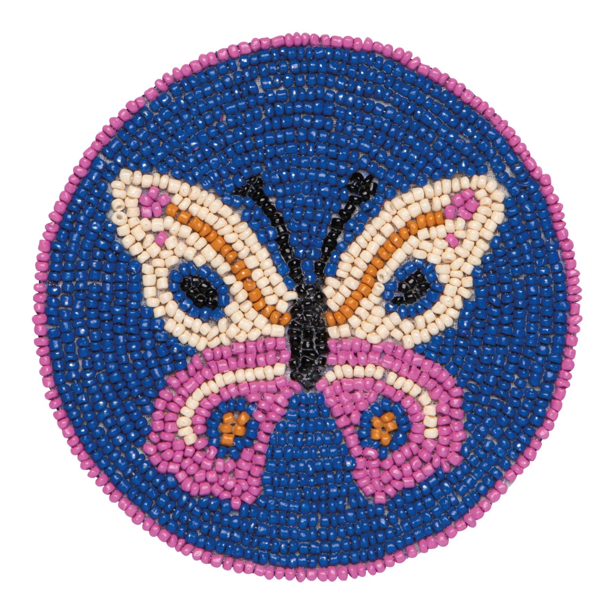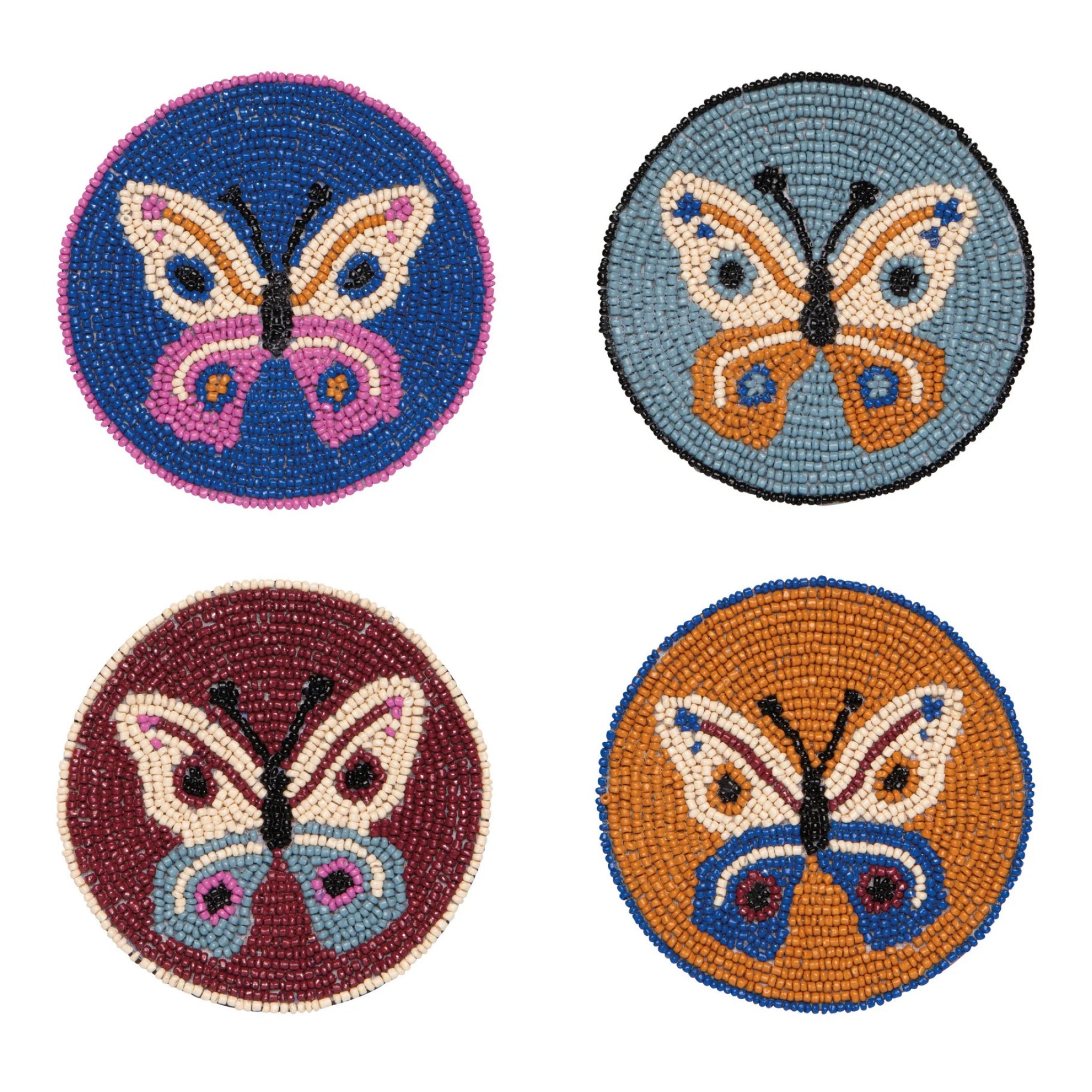 This Aurora beaded coaster set adds color and sparkle to the table with hand beaded glass details and a sturdy fabric backing. Butterfly motifs and sunrise hues bring a playful spring inspired glow to everyday drinks.