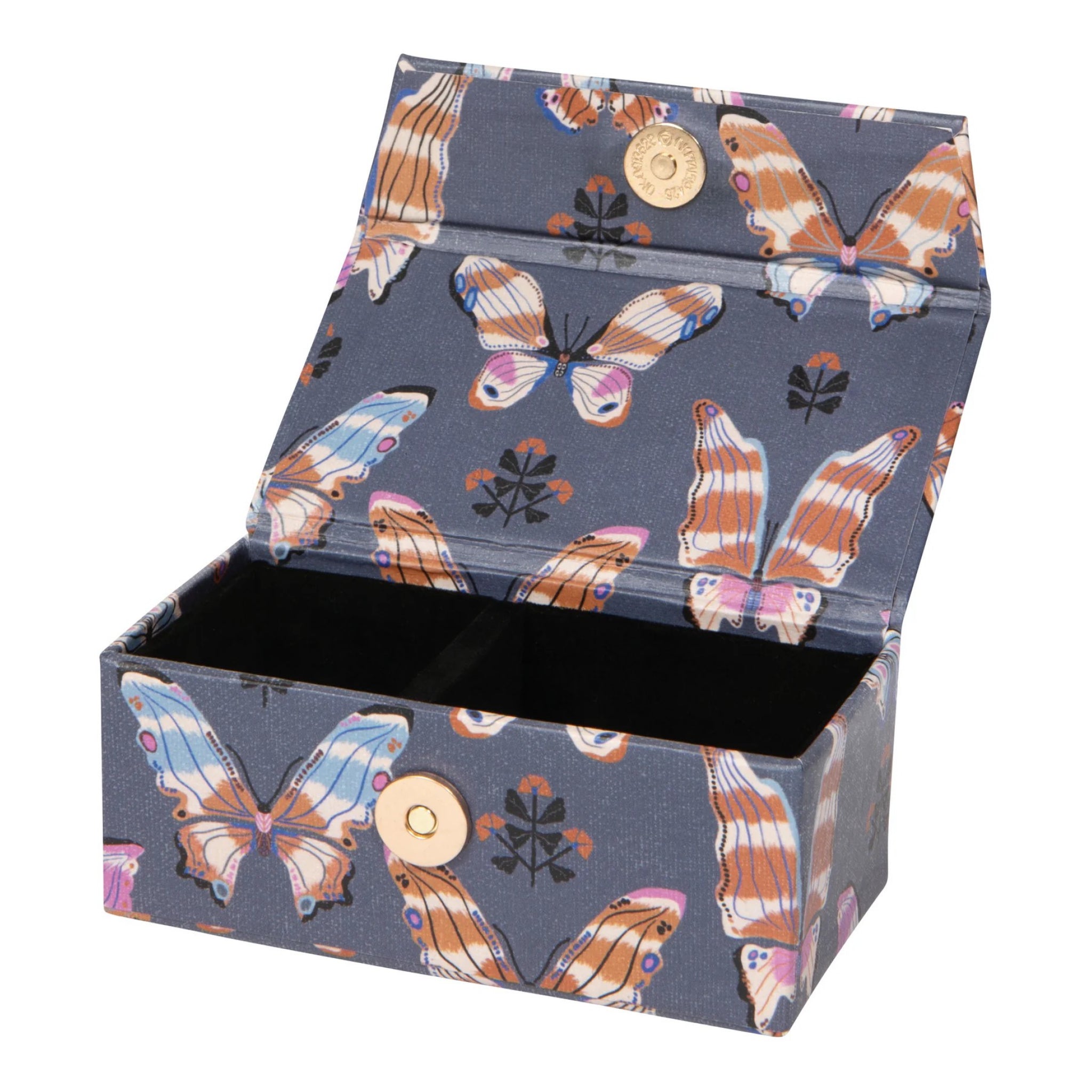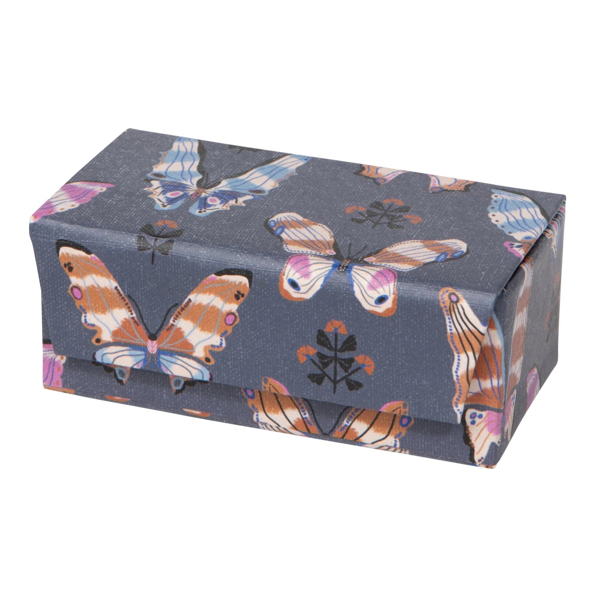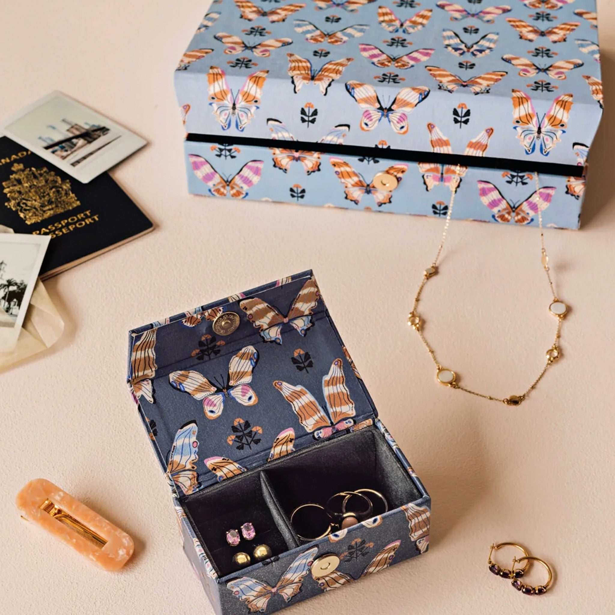 This Aurora travel jewelry case keeps hoops, rings, and small treasures secure with a compact, sturdy design. Butterfly artwork and sunrise colors add a playful, spring inspired touch to everyday organization.