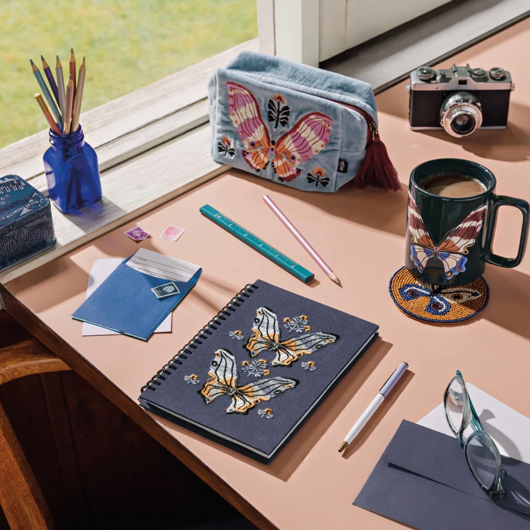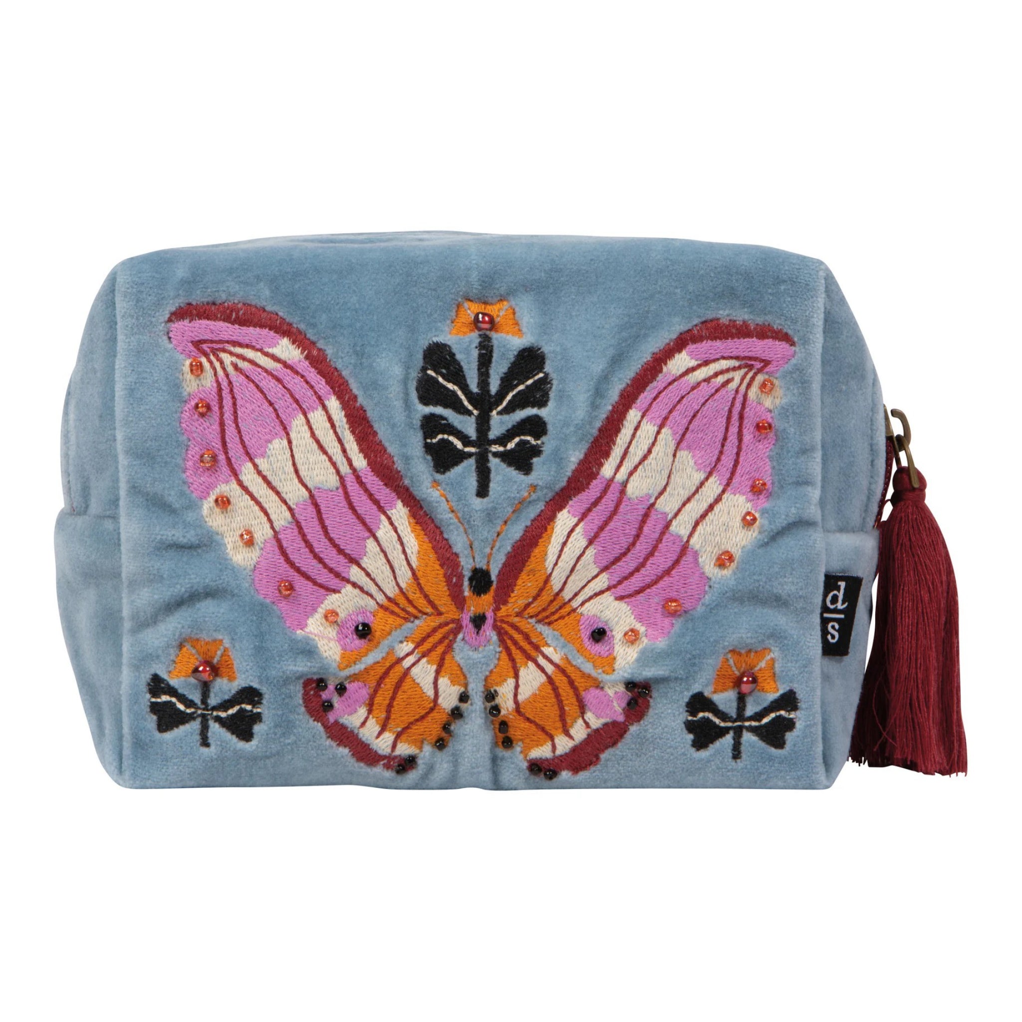 This Aurora embroidered pouch pairs soft cotton velvet with colorful stitching, tassels, and beaded details for a cozy yet sturdy place to hold small essentials. Butterfly motifs and sunrise hues add a playful spring inspired touch.