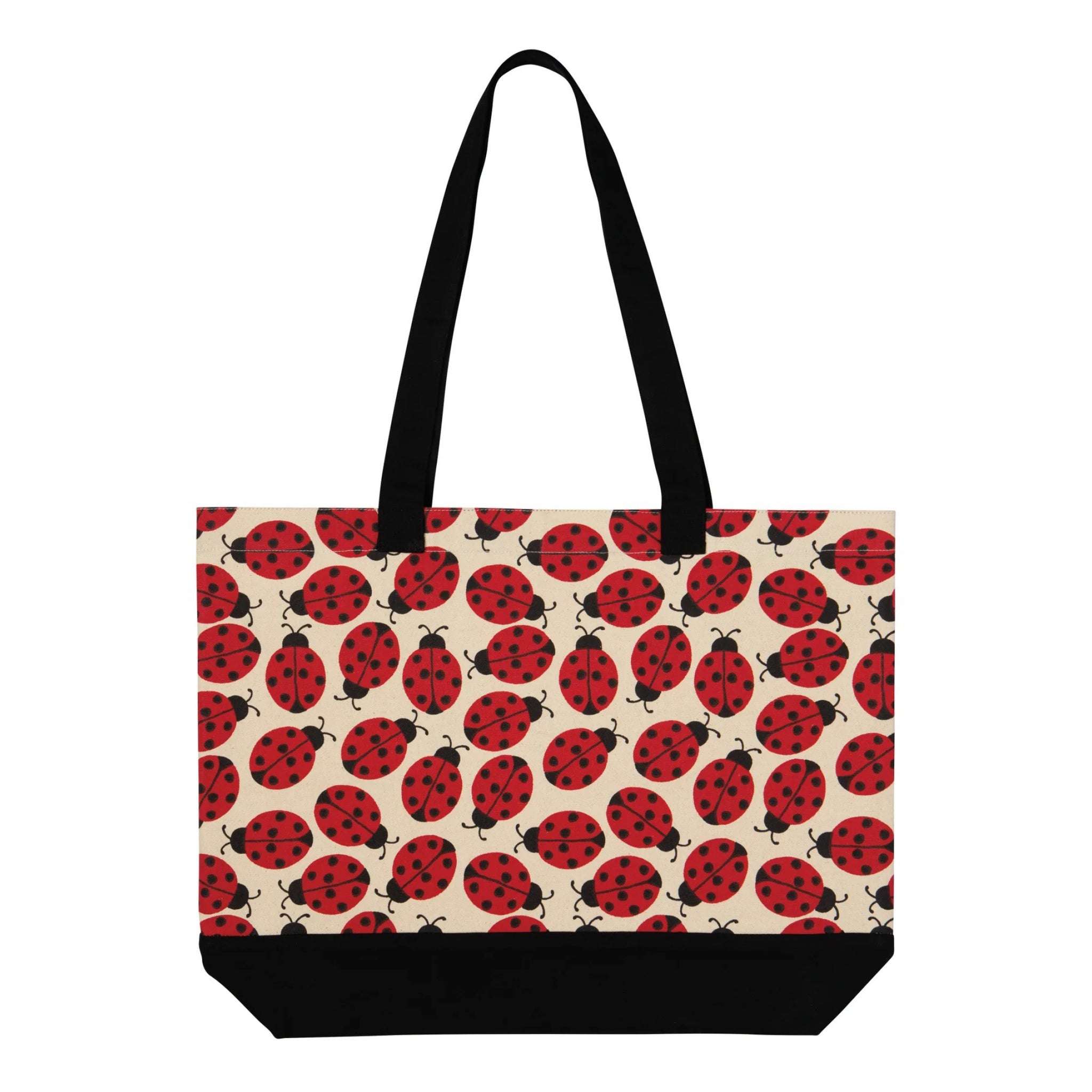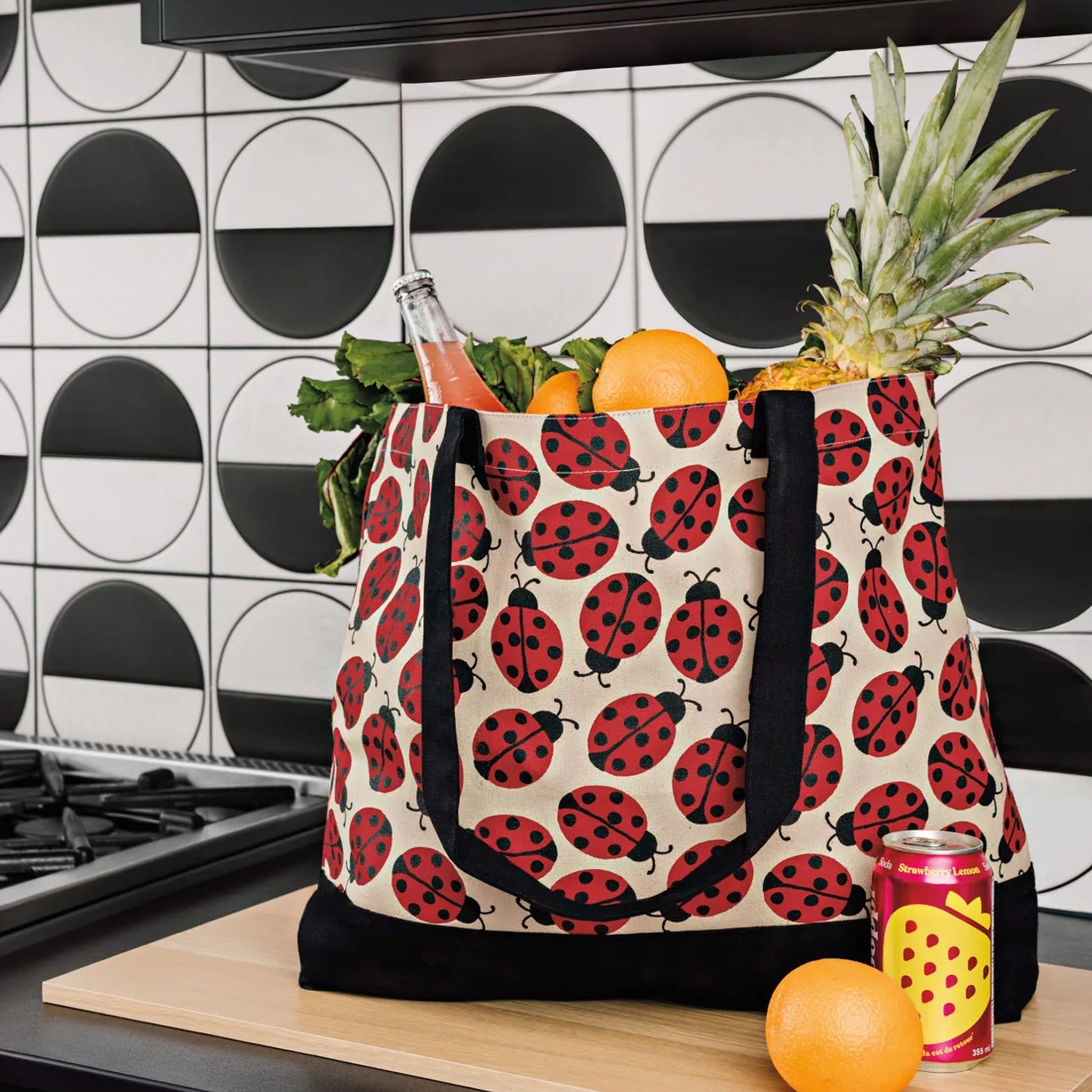 This Ladybugs super tote bag is made for big grocery hauls and everyday errands. Roomy cotton canvas with side gussets and an inner pocket keeps packing easy, while bright ladybug details add playful summer charm.