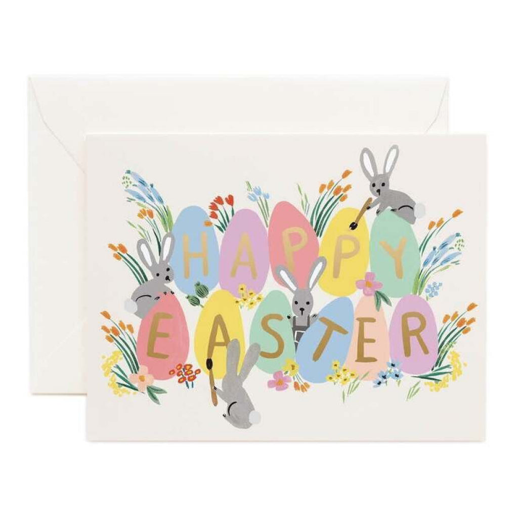 A sweet Easter greeting card featuring pastel eggs, playful bunnies, and spring florals with subtle gold foil accents.