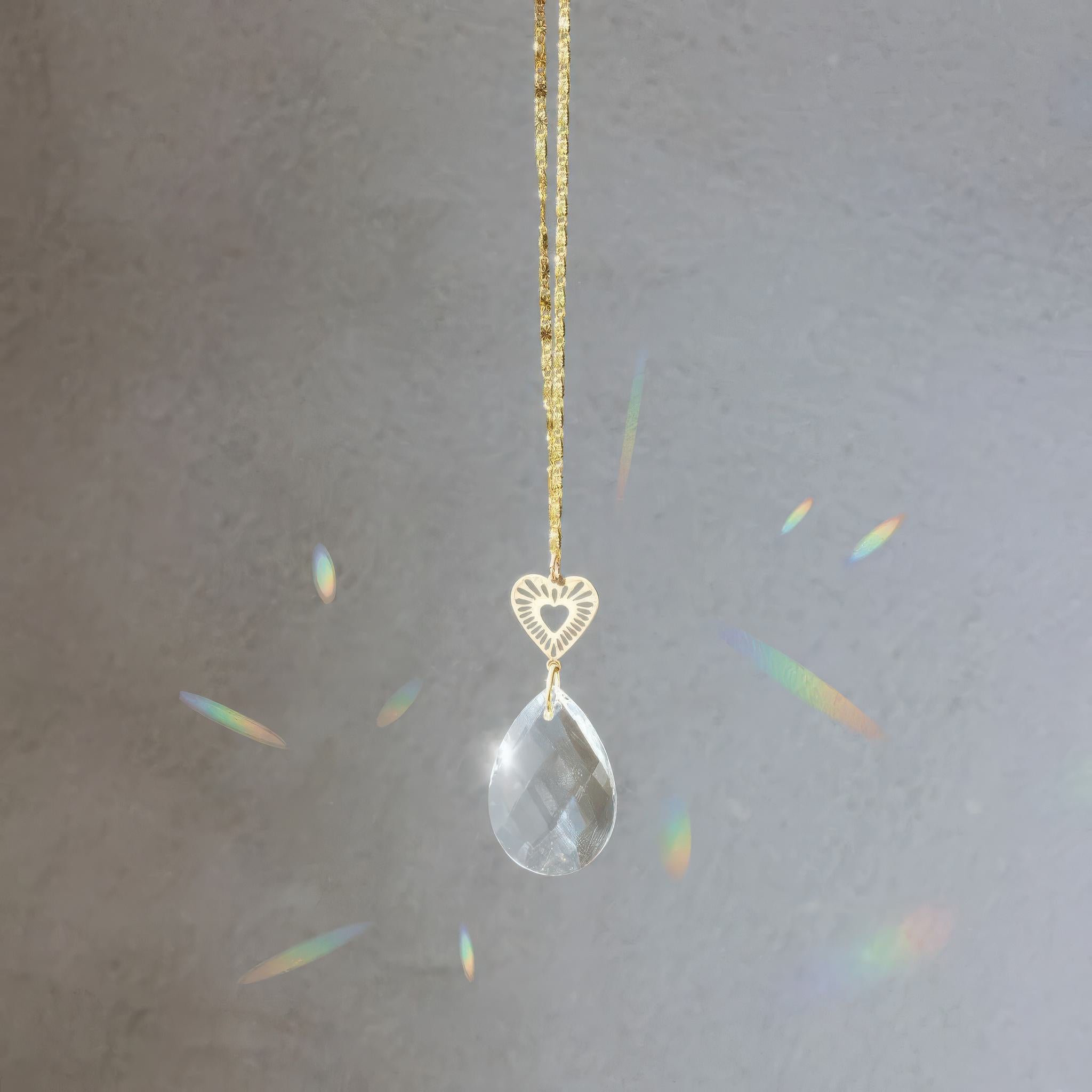 Pocket Suncatcher Radiating Heart fills any space with sparkle and rainbows. This playful light catcher hangs in windows, brightens plants, or adds charm on the go. Made with gold-dipped brass and shatter-resistant glass, this mini rainbow maker is designed for lasting shine and everyday magic.
