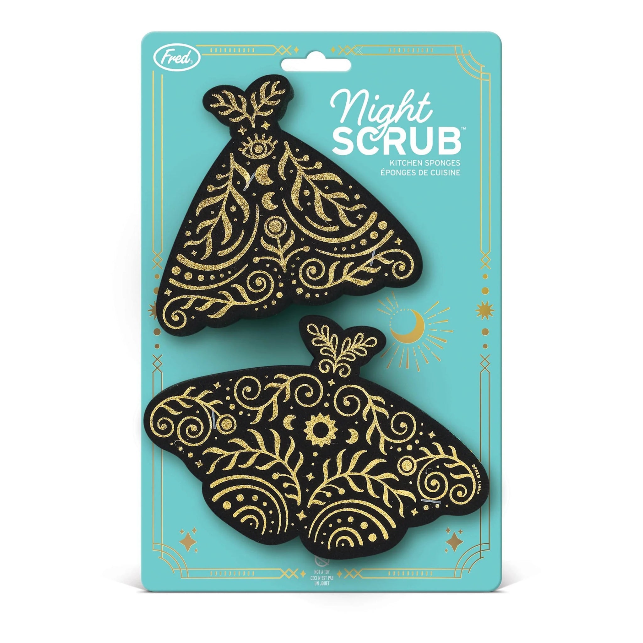 Fred’s Night Scrub Moth Kitchen Sponges make cleaning shine bright. With metallic celestial details and three durable layers, these moth-shaped sponges tackle grime with style. This set of two combines beauty and function, bringing a little starlight sparkle to every scrub. Perfect for kitchens that love a touch of magic.