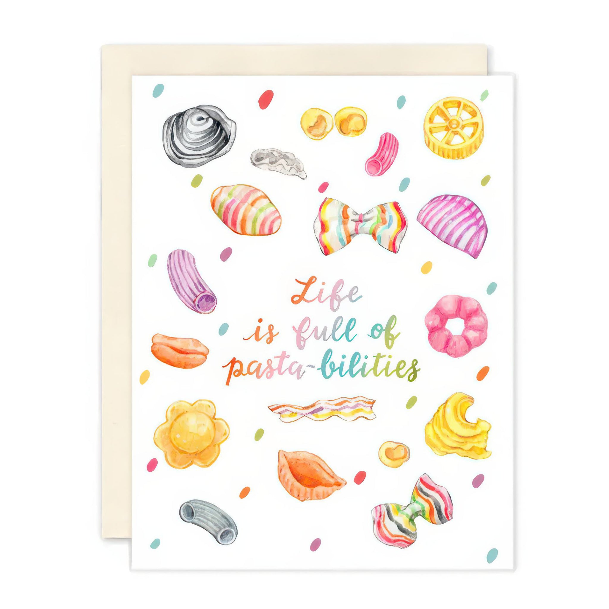 Life is full of pasta-bilities with this playful greeting card featuring colorful watercolor pasta shapes and a cheerful pun.