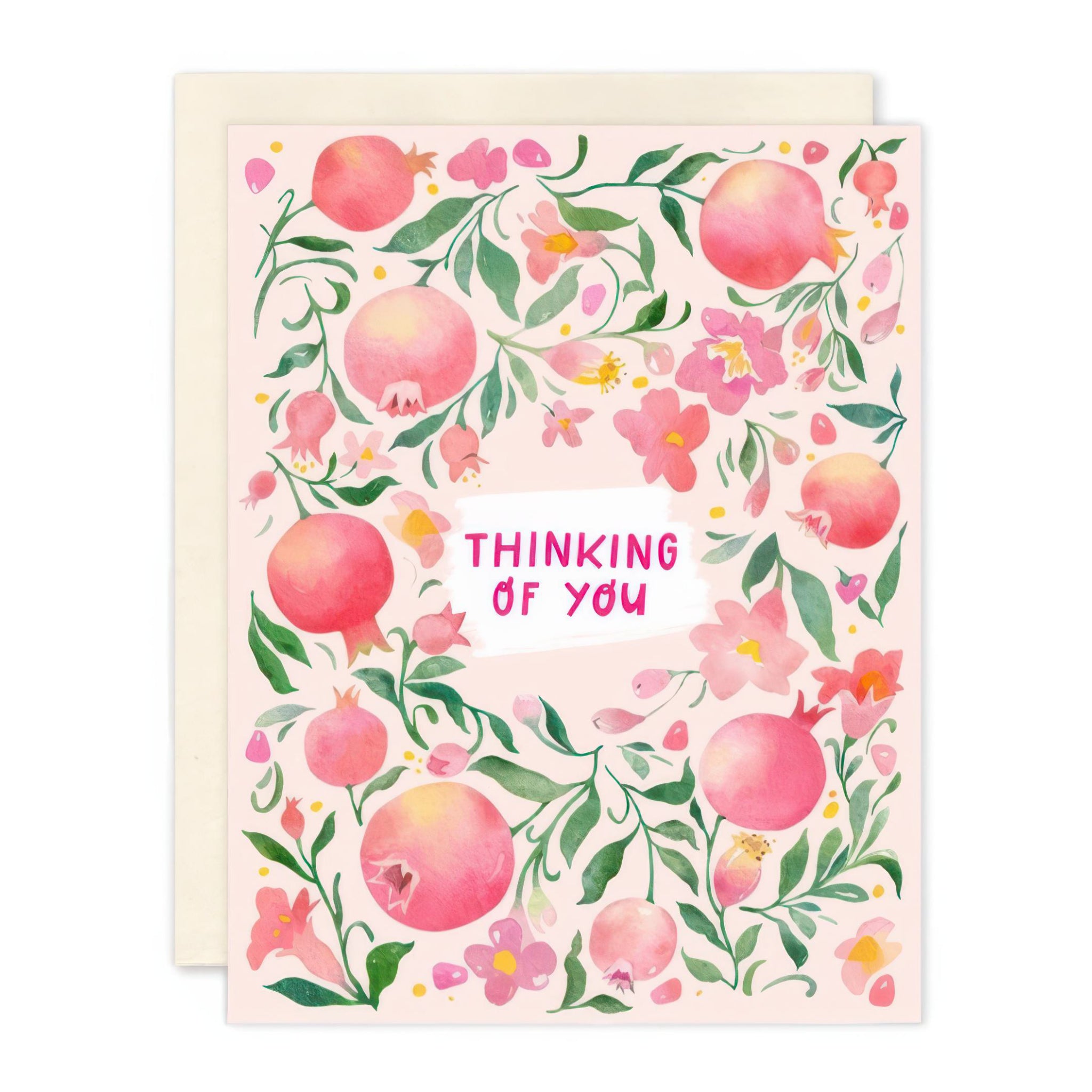 A sweet thinking of you card with watercolor pomegranates and flowers. Bright, cheerful, and perfect for sending a little love.
