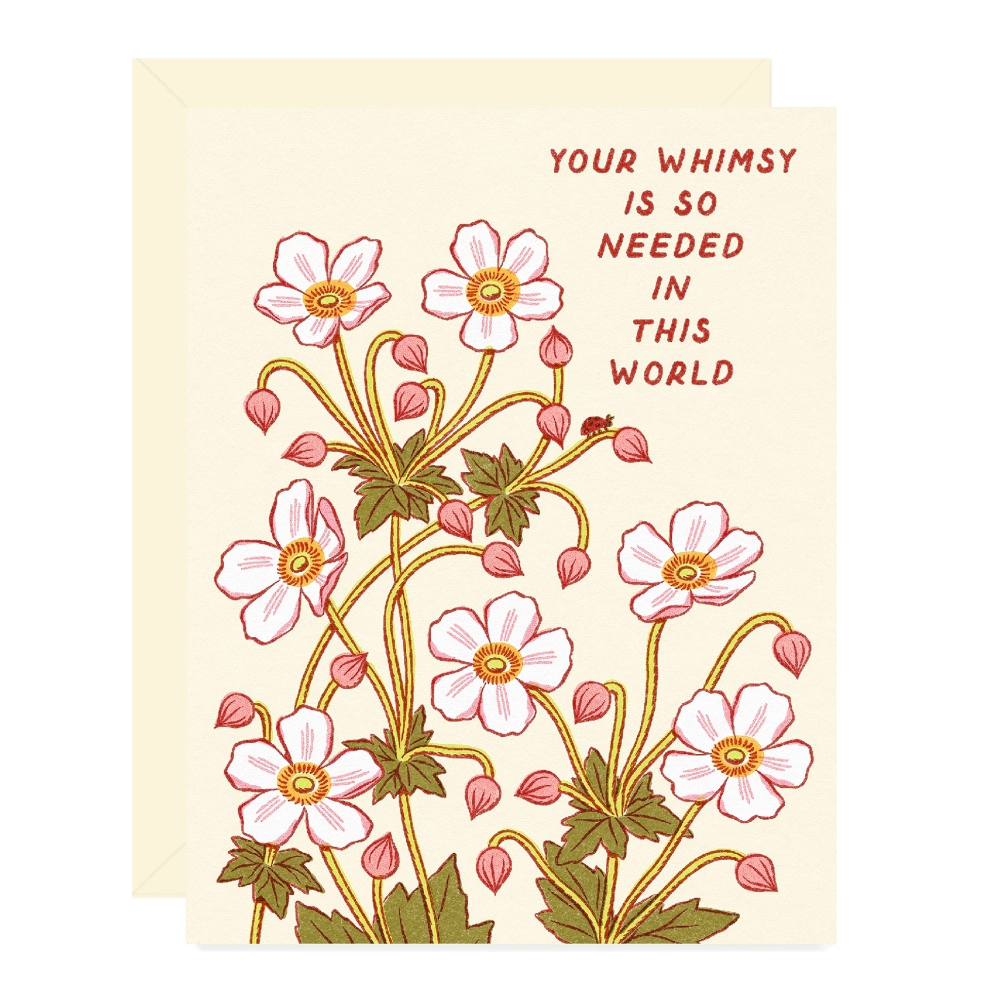 A sweet little reminder to keep the magic alive. This folded card features whimsical florals with the message “Your whimsy is so needed in this world.”