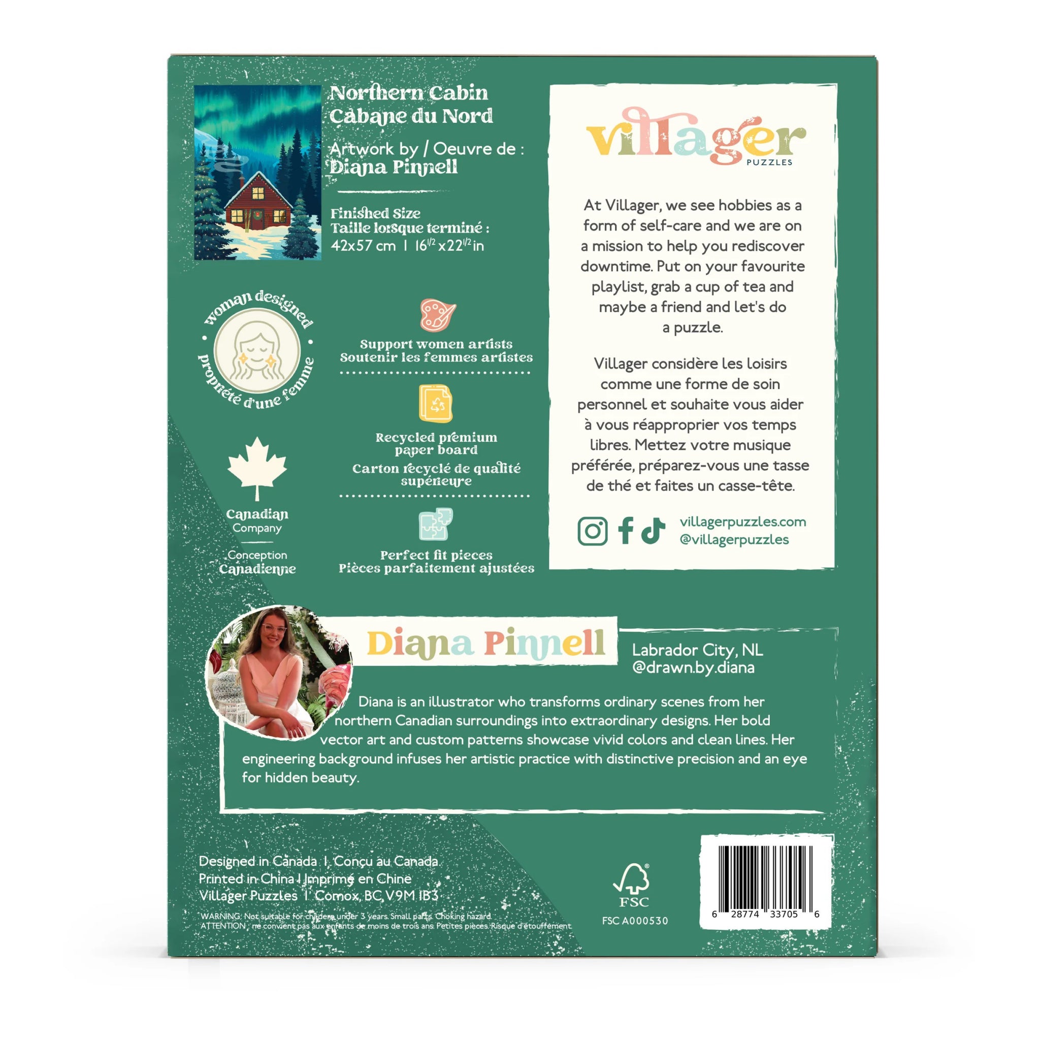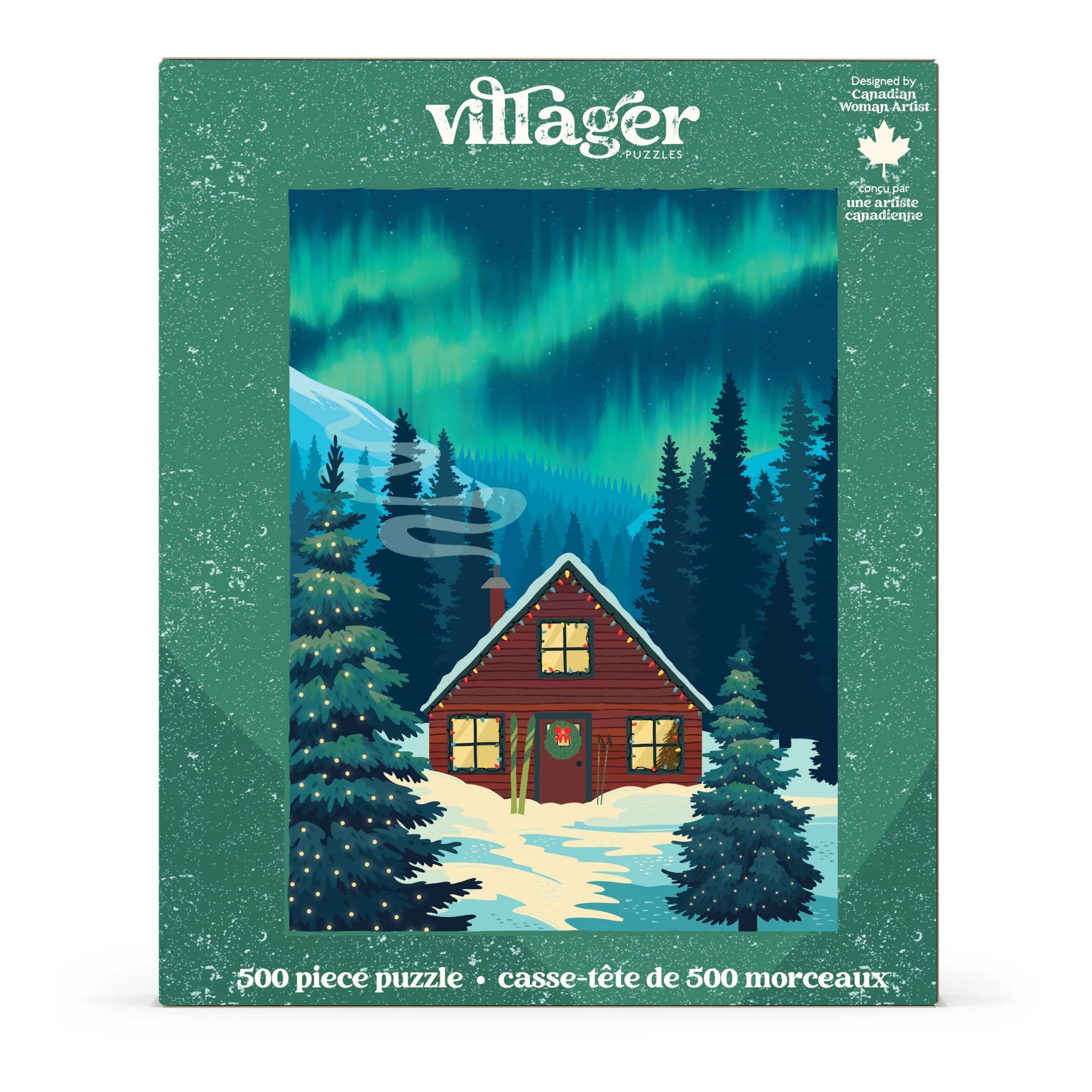 Step into the magic of a Canadian winter with this enchanting puzzle by Newfoundland artist Diana Pinnell. A cozy cabin glows beneath the northern lights, nestled among twinkling evergreens and snowy woods. With rich details and a peaceful atmosphere, this puzzle captures the warmth, wonder, and natural beauty of a northern Christmas retreat.