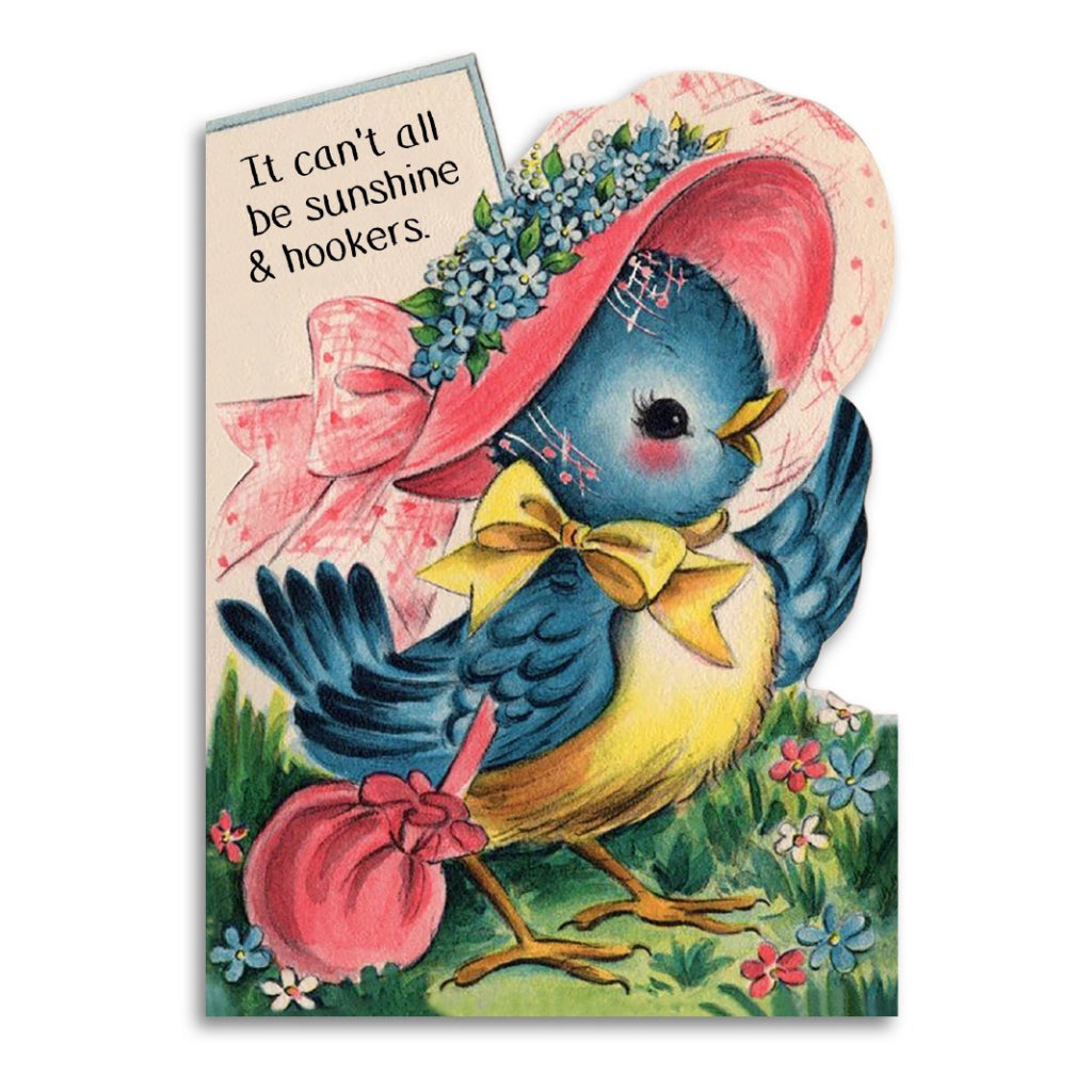 This vintage inspired card delivers a blunt little reminder that not every day is sunshine and hookers. A funny, lighthearted pick for get well wishes, breakups, or any rough patch.