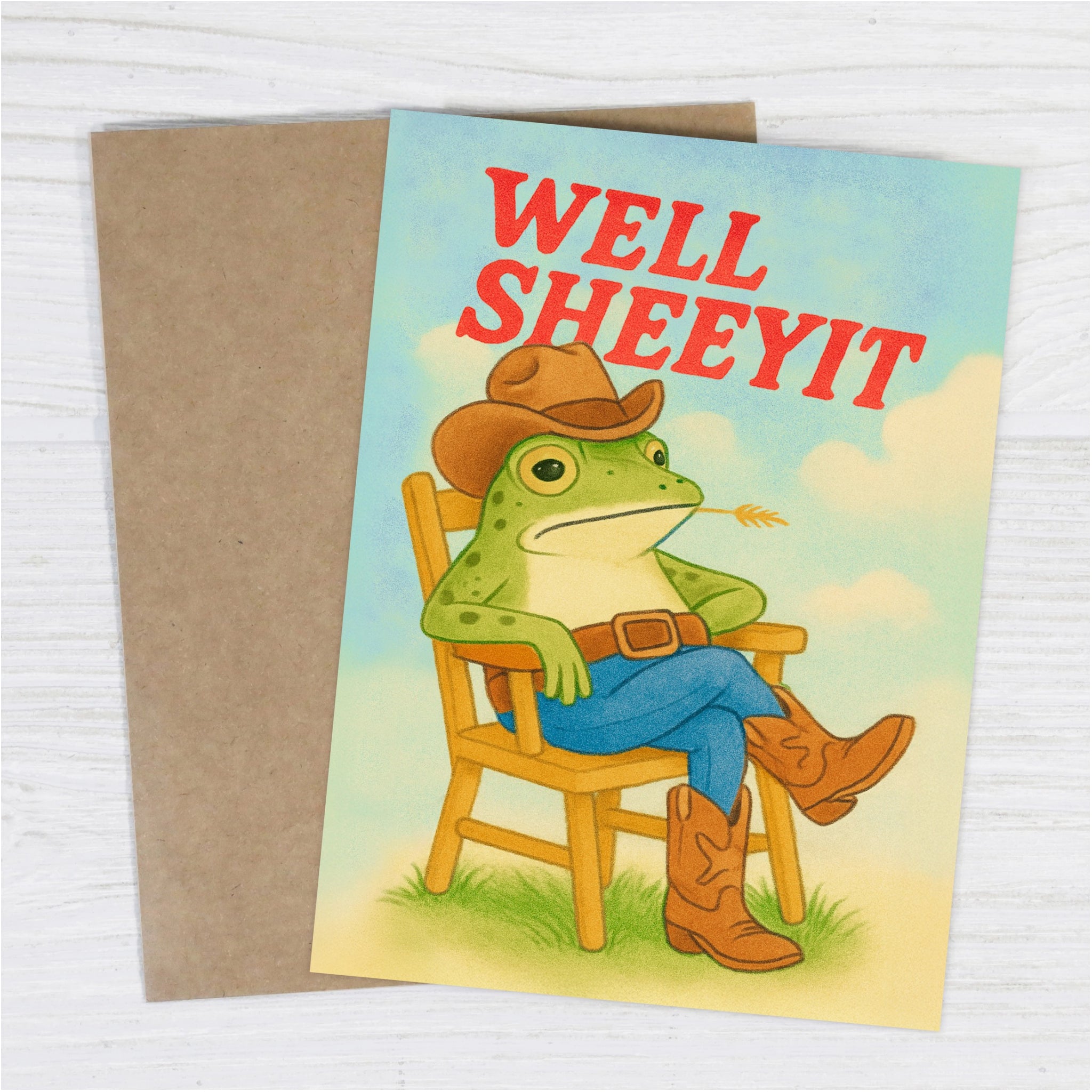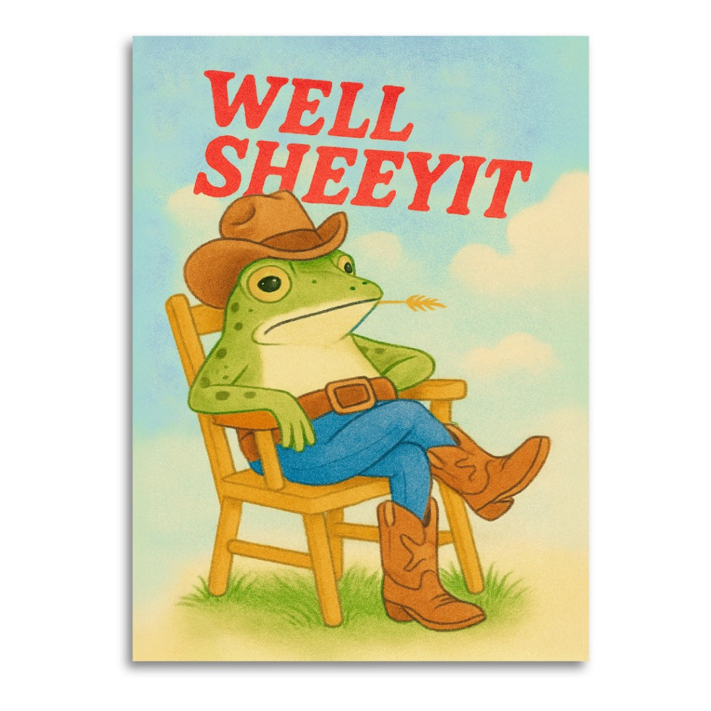 This funny just because card delivers a classic reaction with a retro twist. Featuring a cowboy frog and a blunt little well sheeyit, it’s perfect for friends who love dry humour and vintage style.