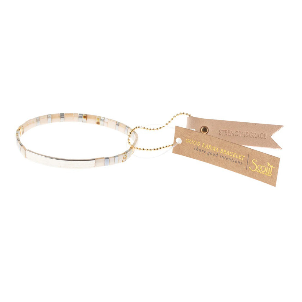 Share a little intention with the Good Karma Miyuki Bracelet Strength & Grace Silver. Soft matte and pearlescent Japanese glass beads meet a sleek sterling silver dipped bar engraved with a meaningful reminder for everyday wear.