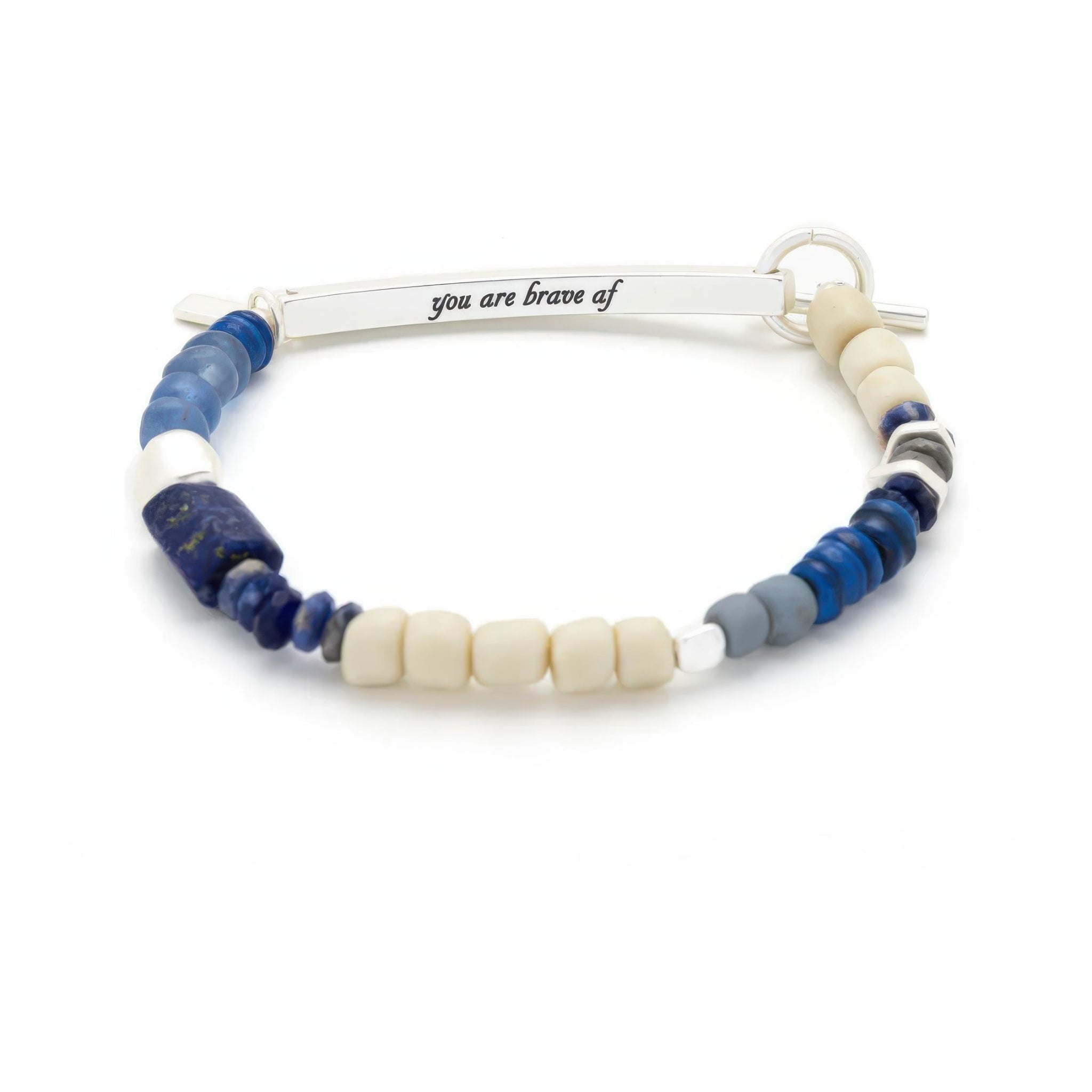 Hidden Message Bracelet Brave AF is made to empower with bold energy and style. Each bracelet reveals a hidden affirmation, from fearless to inspiring. Designed with semi-precious stones and accented by gold and silver-dipped beads, it blends strength with meaning. A matching metal charm is included, perfect to wear or share as an extra accessory.