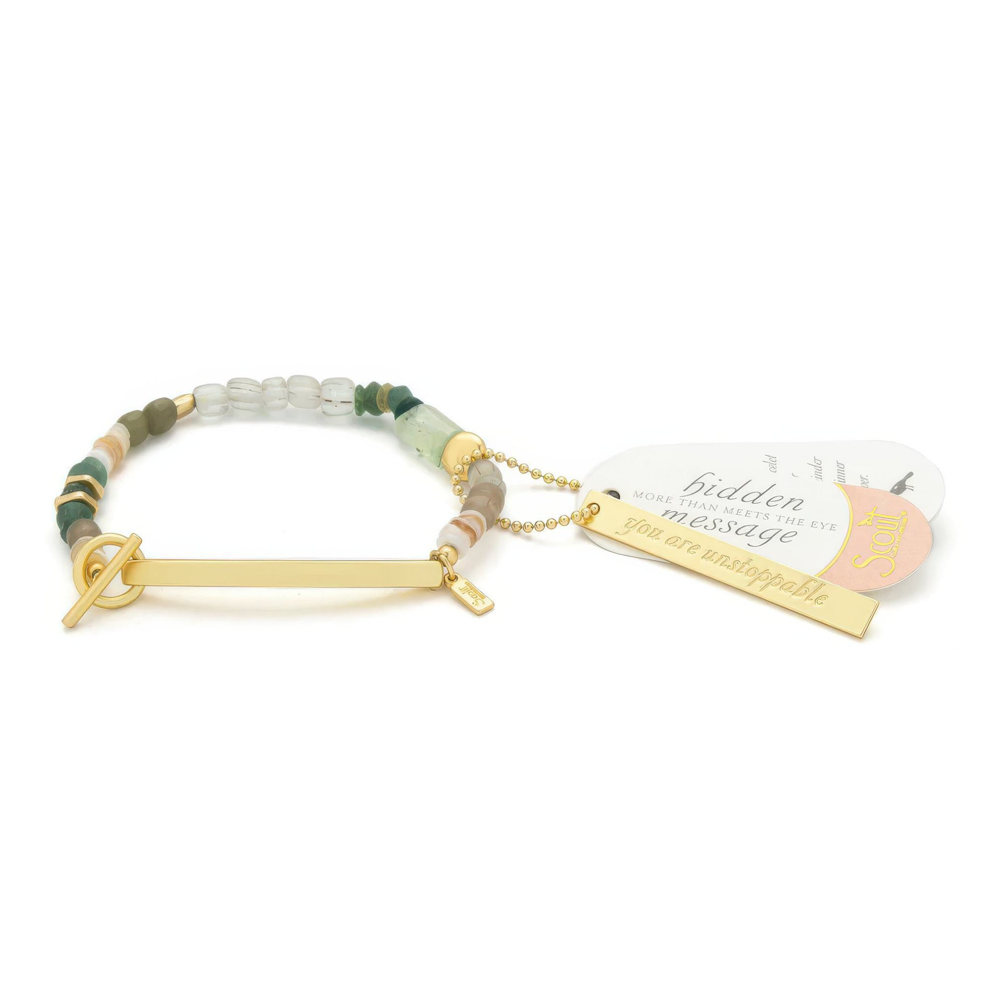 Hidden Message Bracelet Unstoppable is made to inspire strength and confidence. Each bracelet reveals a hidden affirmation, from motivating to bold. Crafted with semi-precious stones and accented by gold and silver-dipped beads, it combines meaning with style. Every bracelet also comes with a matching metal charm, perfect to wear or share as an extra accessory.