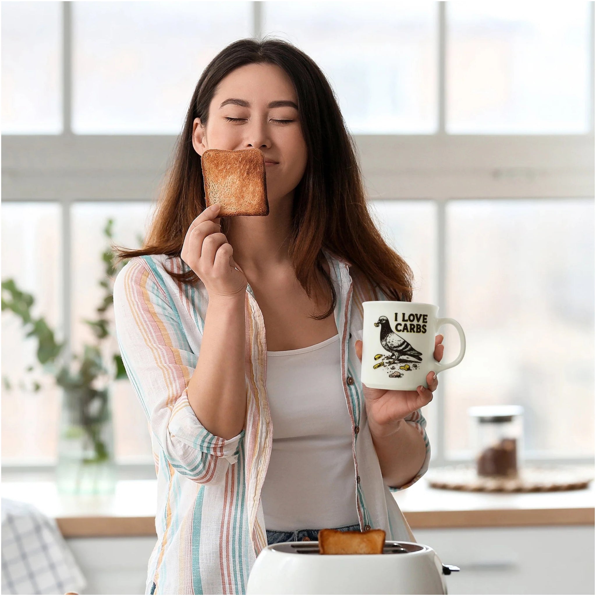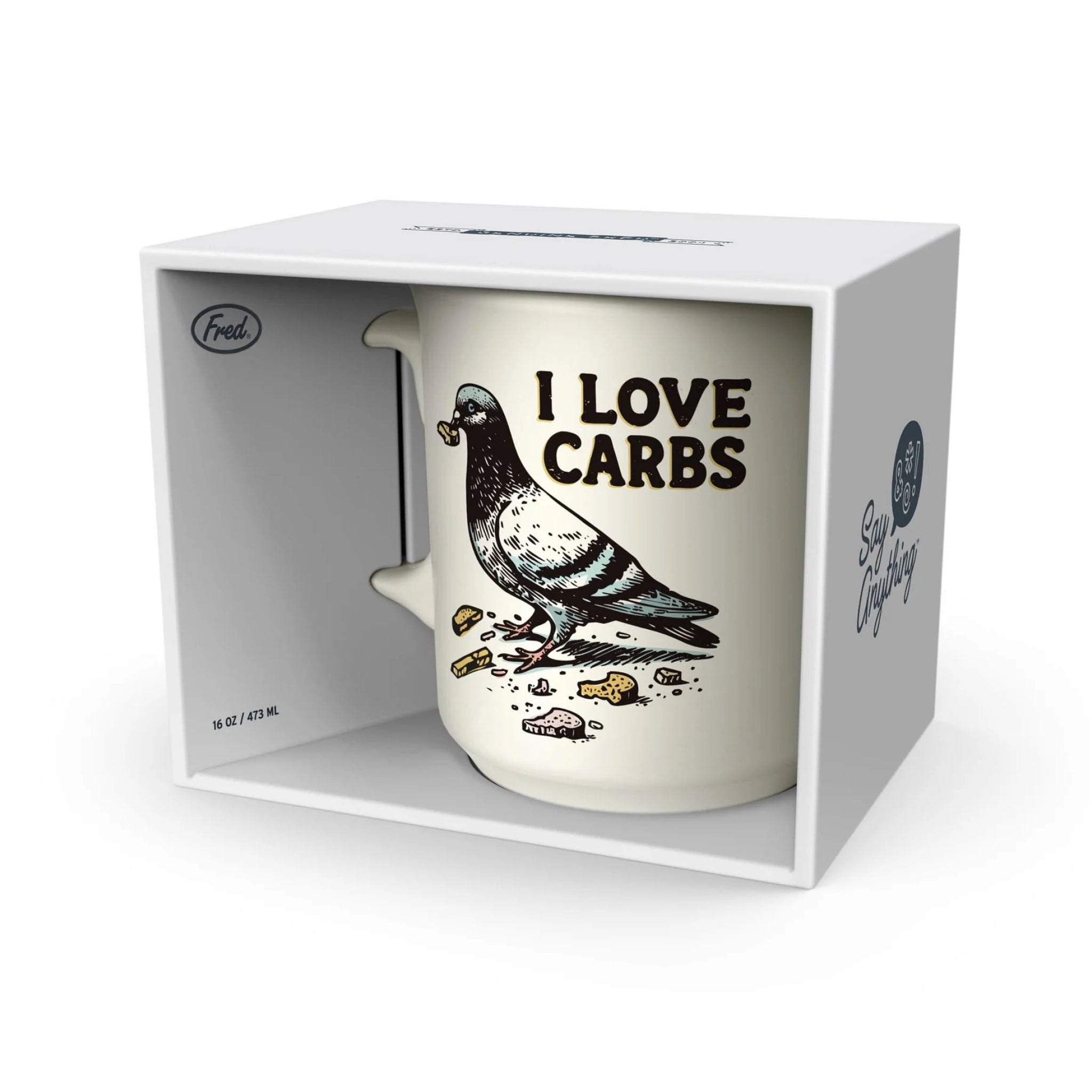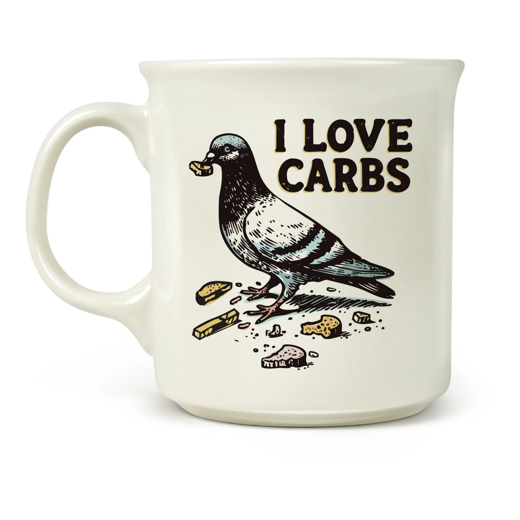 The I Love Carbs Mug features a cheeky pigeon illustration and bold lettering that celebrates bread, snacks and unapologetic cravings. This ceramic coffee mug makes a fun gift for food lovers, brunch fans and carb enthusiasts alike.