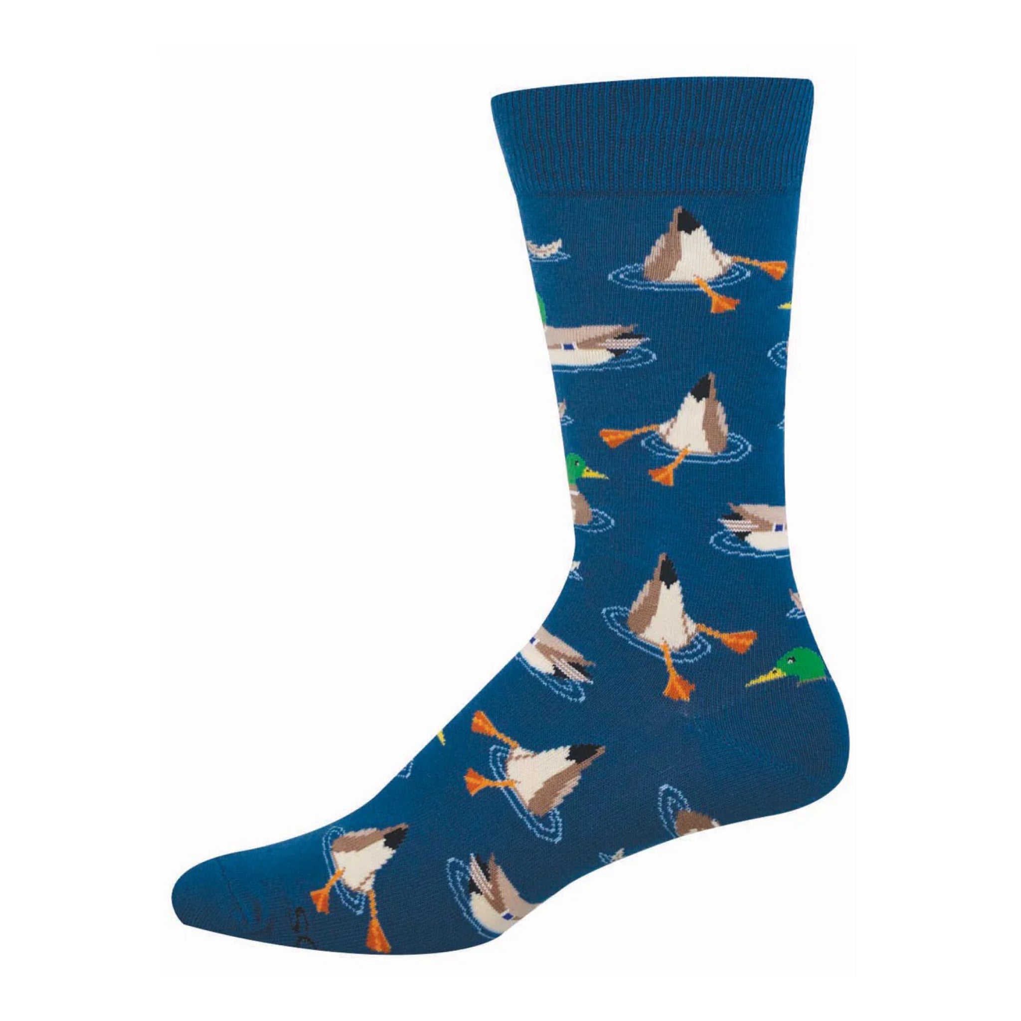 Add a splash of pond side humor to everyday outfits with blue crew socks covered in ducks mid dive, tails up and heads down. A cheerful pick for bird lovers and nature fans.