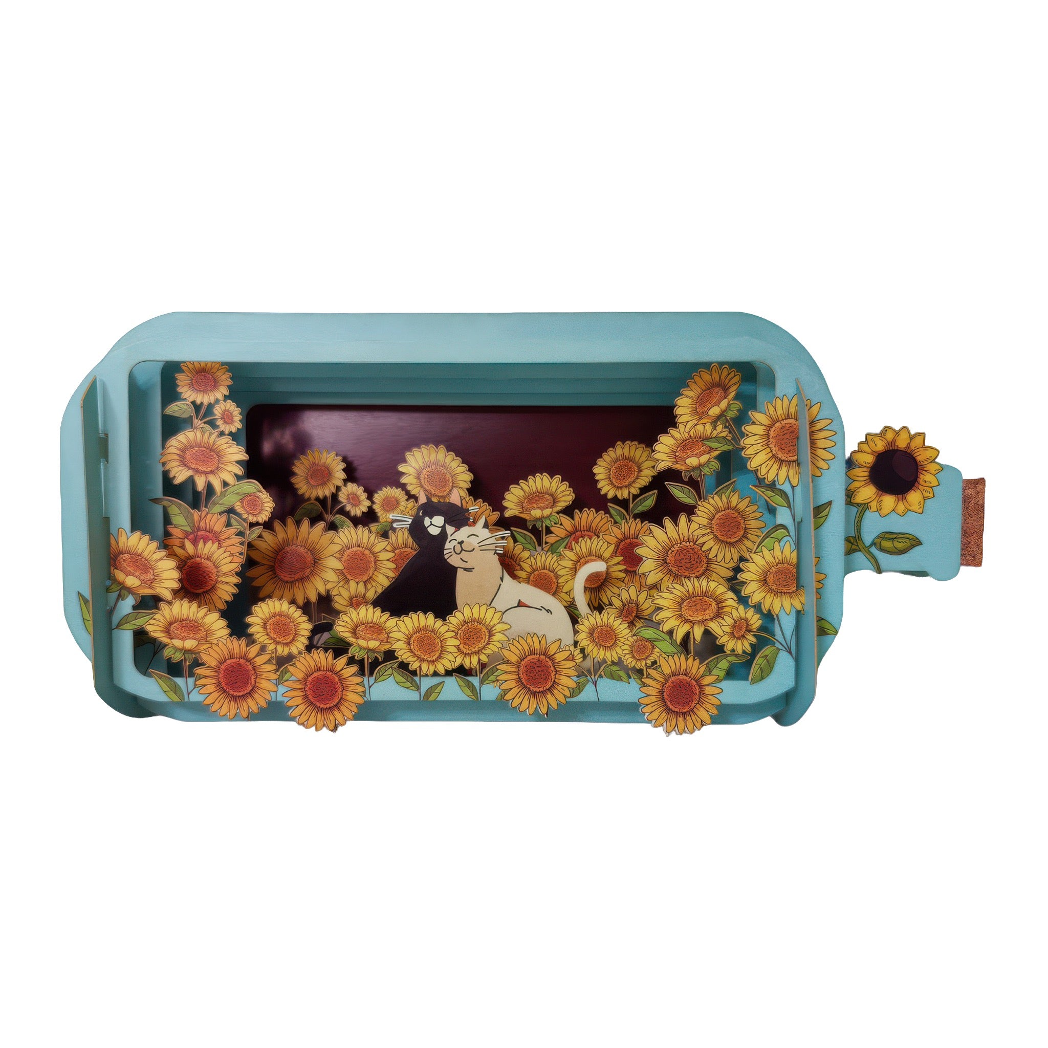 A beautifully detailed message in a bottle card featuring cats nestled among bright sunflowers. The layered laser cut design creates a charming keepsake display, with space on the back for your own note.