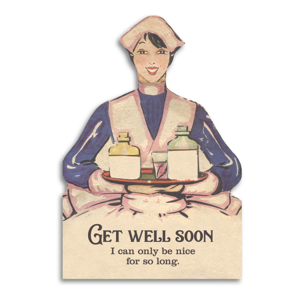 This vintage inspired get well card mixes care with a little sarcasm. A funny way to say feel better fast, because the nice phase has a time limit.