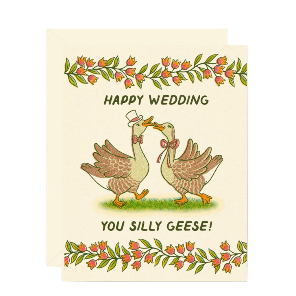 Celebrate the happy couple with two silly geese dressed for the big day, meeting under braided tulips with the message “Happy wedding you silly geese!” A playful card that keeps things light and full of love.