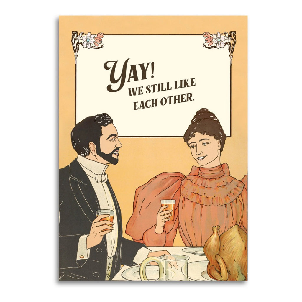 This funny anniversary card keeps it real: yay, you still like each other. A vintage inspired way to celebrate love, commitment, and making it through another year with humour intact.