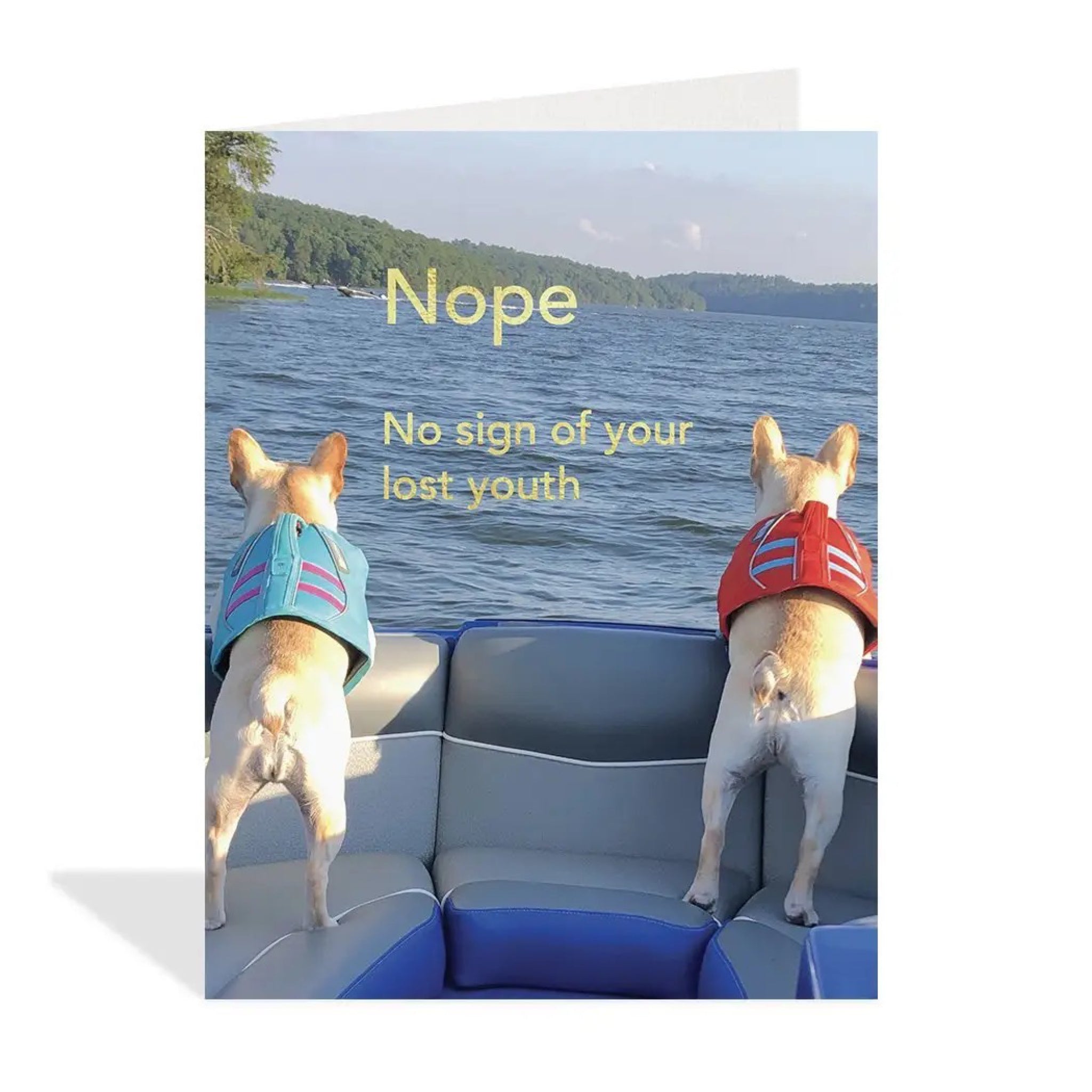A funny birthday card featuring two dogs on a boat with the message 'no sign of your lost youth.' Perfect for celebrating with humour.